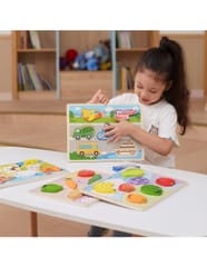 Drewniane Puzzle od marki VIGA w motywie warzyw. W zestawie znajduje się kolorowa plansza oraz 7 elementów. Zabawa polega na dopasowaniu kafelków warzyw do odpowiednich miejsc na kolorowej podstawce, na której dla ułatwienia znajdziemy rysunki brakujących elementów. Taka zabawa pomoże kształtować precyzję ruchów rączek, oraz poprawić koordynację wzrokowo-ruchową, a także ćwiczyć pamięć, logiczne myślenie i koncentrację. Dzięki grubości elementów, puzzle mogą być wykorzystywane do innych zabaw jako figurki.