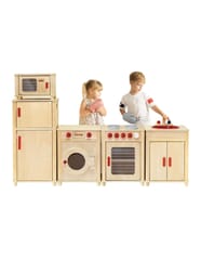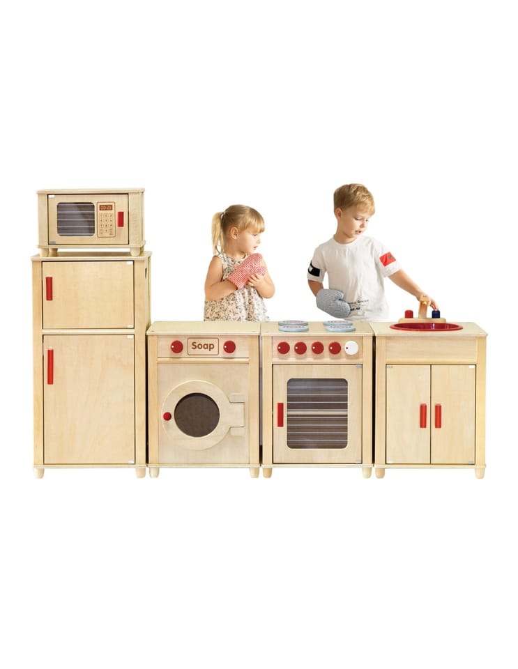 Drewniany Ogromny Zestaw Kuchenny Natural dla dzieci od marki Viga pozwoli na zabawę kilkoro dzieci jednocześnie. Komplet idealnie sprawdzi się jako kącik zabaw dla dzieci od 3 roku życia. Kuchnia składa się z kuchenki z piecykiem, szafki ze zlewem, lodówki, kuchenki mikrofalowej oraz pralki. Wykonane z drewna bukowego oraz sklejki brzozowej mebelki można ustawić w dowolnej kolejności. Szerokość każdego z segmentów wynosi 40 cm a ich głębokość to 34 cm. Całkowita szerokość zestawu wynosi 160 cm, wysokość od ziemi do blatu to 53 cm a wysokość całkowita wynosi 120 cm. Zestaw do samodzielnego montażu według załączonej instrukcji krok po kroku.