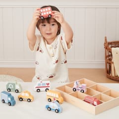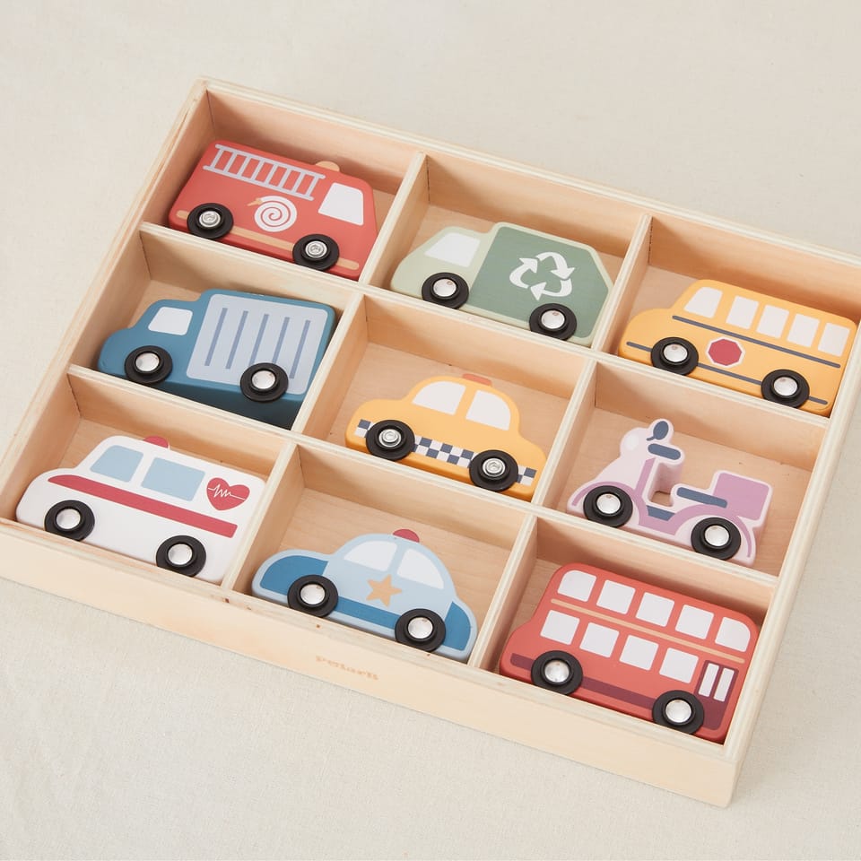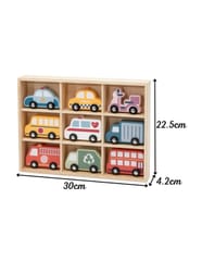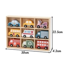 - - 9 drewnianych pojazdów (m.in. wóz strażacki, ambulans, taksówka, autobus piętrowy)