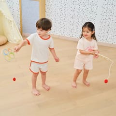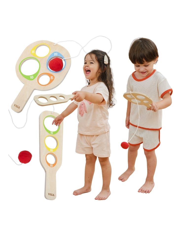 Wprowadź swoje dziecko w świat aktywnej zabawy z drewnianym Zestawem Paletek do Gry Złap Piłkę od VIGA! Ten unikalny zestaw zawiera dwie drewniane paletki o różnych, interesujących kształtach: jedną dłuższą i jedną kwadratową. Paletki posiadają otwory z oznaczeniem punktowym (10, 20, 30, 40, 50), co umożliwia rywalizację i zdobywanie punktów poprzez trafianie piłeczką. Zestaw zawiera dwie miękkie piłki-woreczki, które są solidnie przymocowane do paletek za pomocą sznurków, dzięki czemu są bezpieczne i niemożliwe do zgubienia. Zabawka rozwija u dziecka koordynację wzrokowo-ruchową, świadomość przestrzenną oraz umiejętność koncentracji i samoregulacji. Gra polega na zarzucaniu piłki tak, aby wpadła do jak najmniejszego otworu, co gwarantuje wyższy wynik i satysfakcję. To świetny sposób na spędzenie czasu na świeżym powietrzu lub w domu, zapewniając jednocześnie rozwój ruchowy i logiczne myślenie.