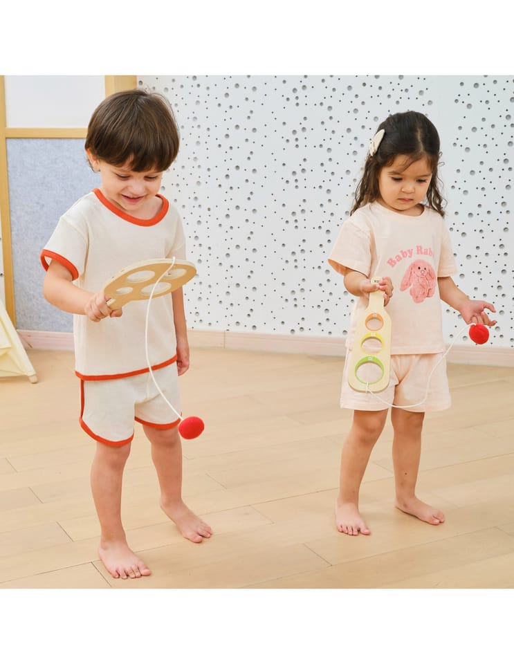 - - Zestaw zawiera dwie drewniane paletki i dwie piłki/woreczki na sznurkach.