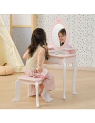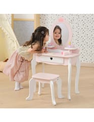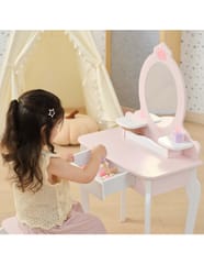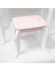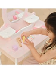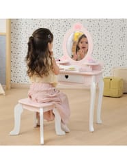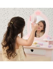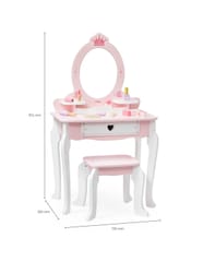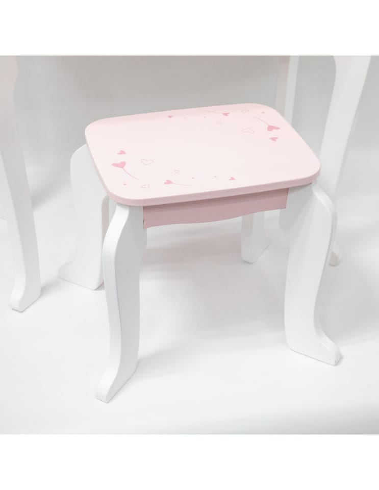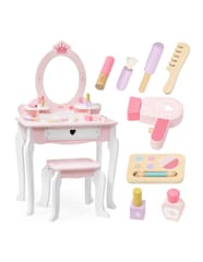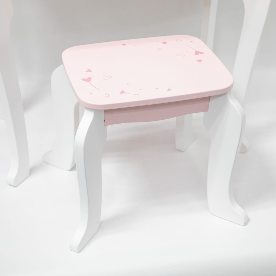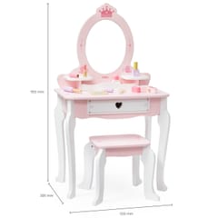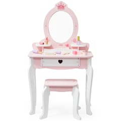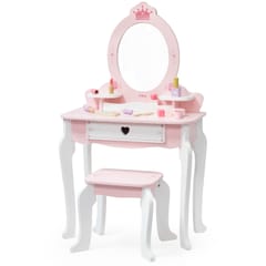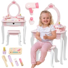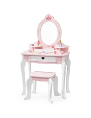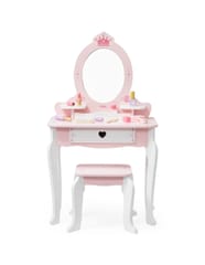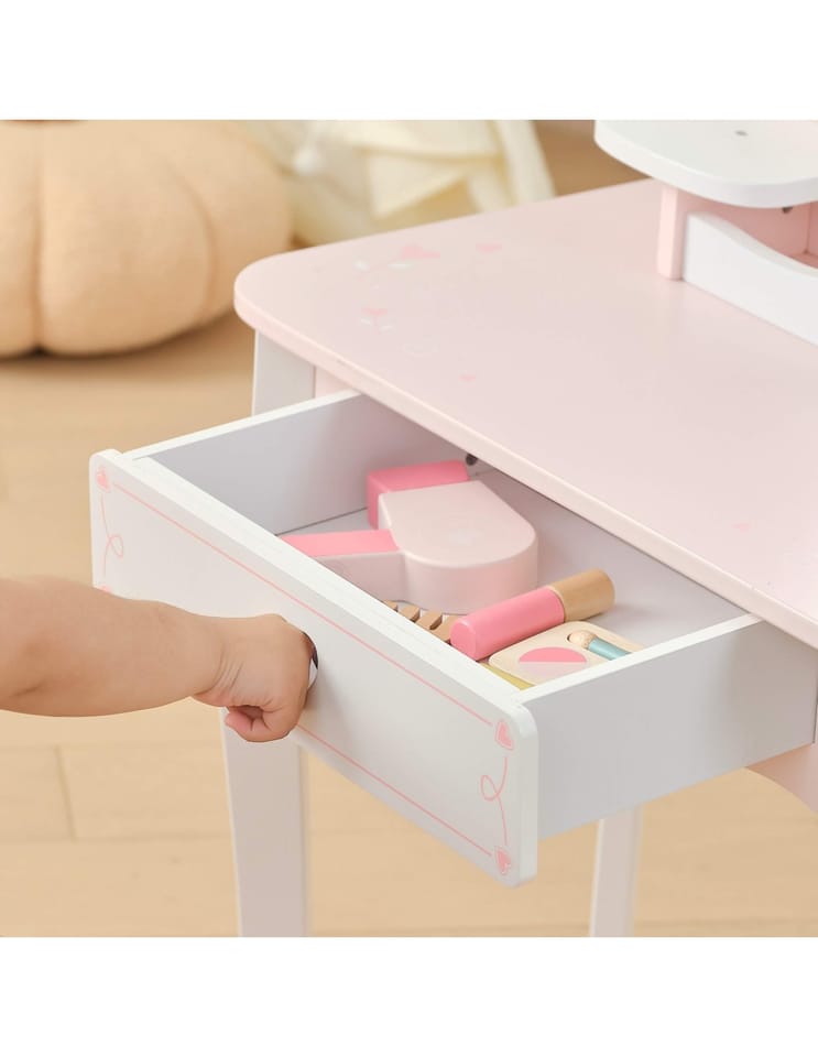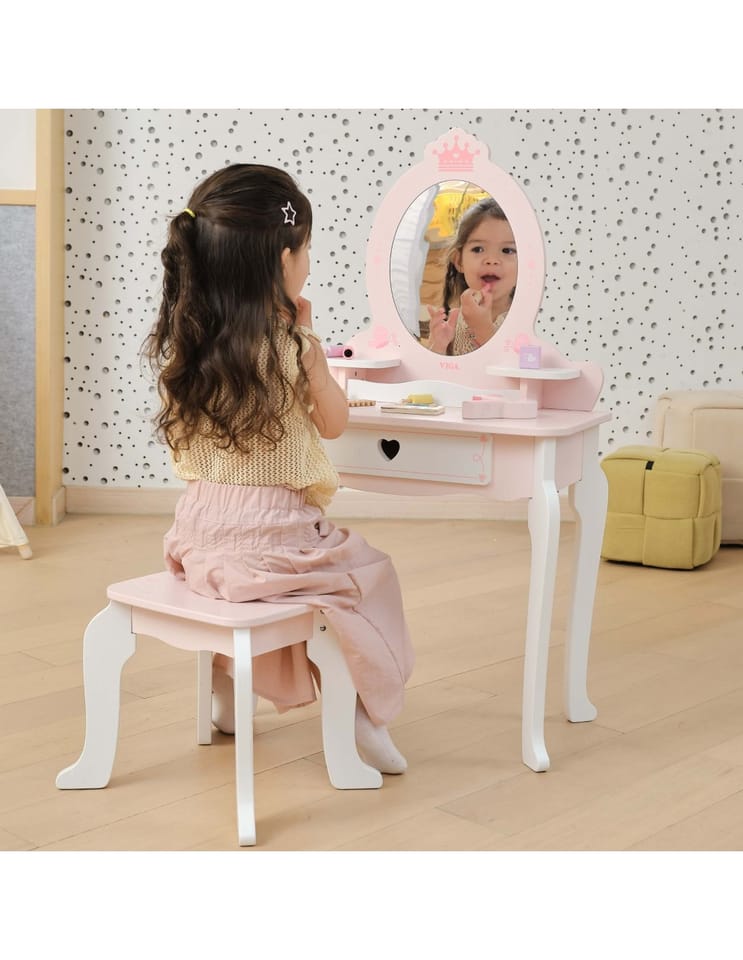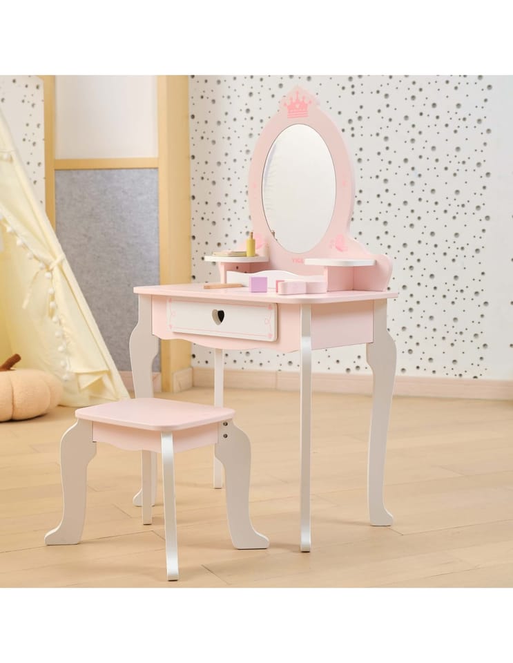 ✔️Toaletkę z lustrem – bezpieczne lusterko w eleganckiej, różowej ramie z ozdobną koroną. ✔️Wygodny stołeczek – dopasowany do toaletki, stabilny i uroczo ozdobiony.✔️Pojemną szufladę – idealną do przechowywania akcesoriów i skarbów małej księżniczki.✔️Zabawka nie zawiera ostrych krawędzi.✔️Pomalowana nietoksycznymi farbami.