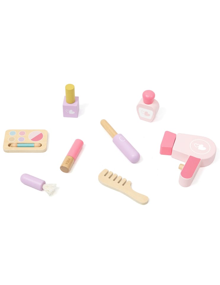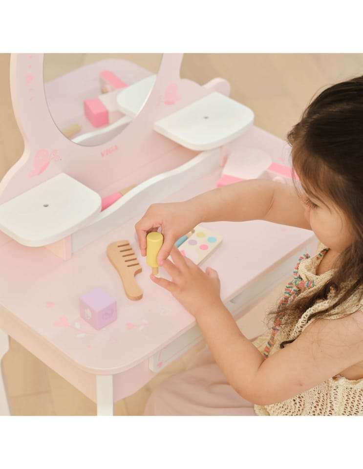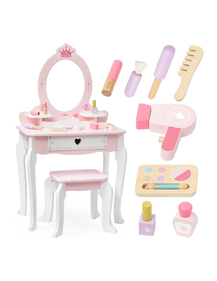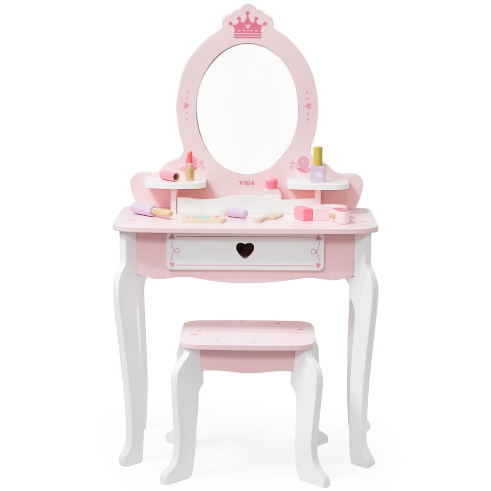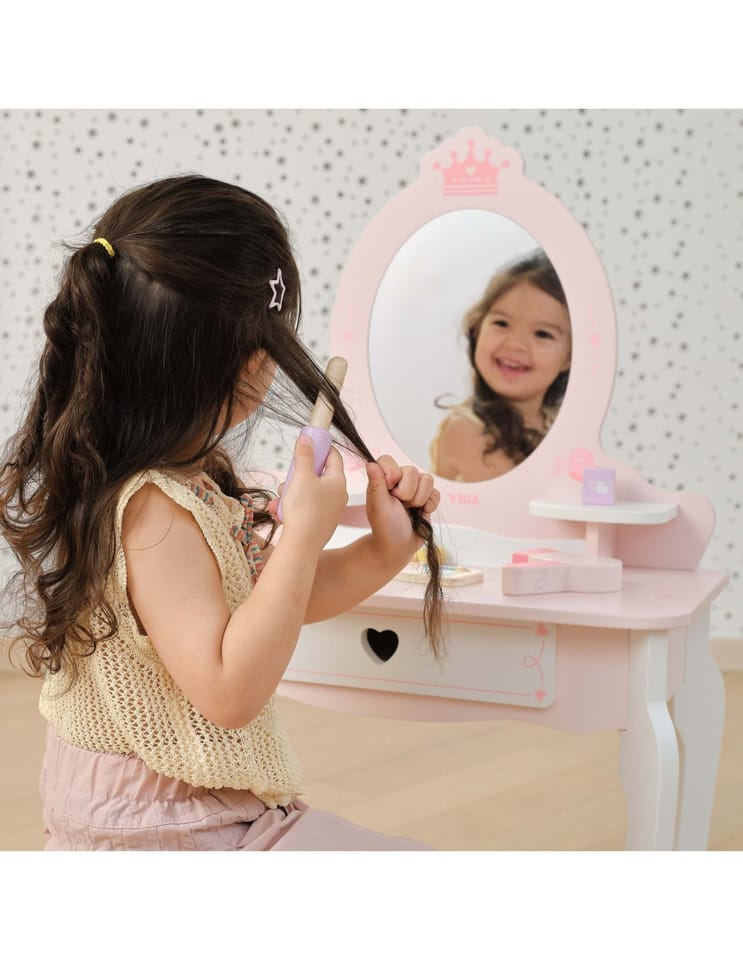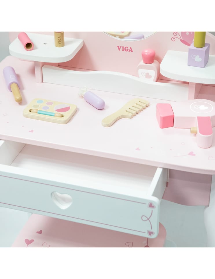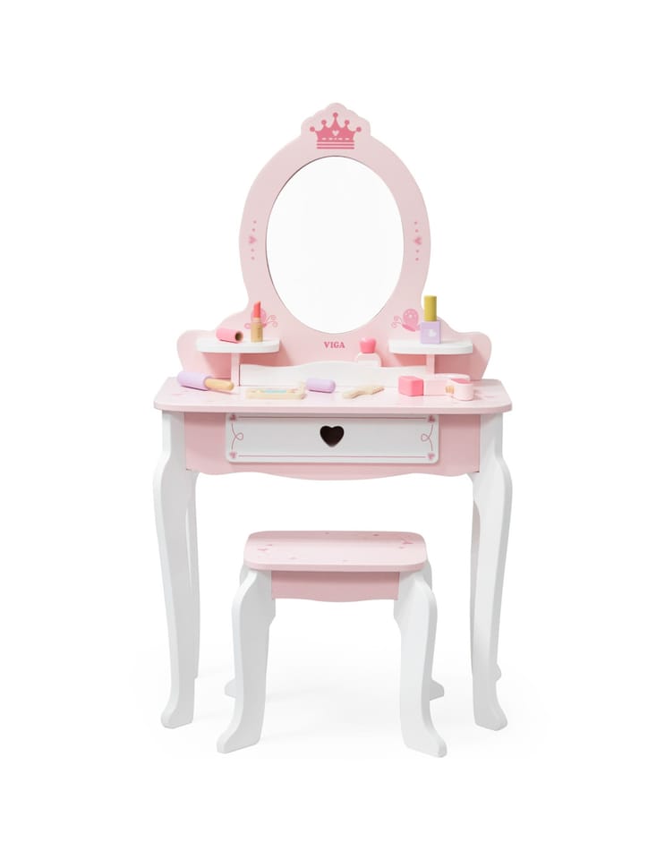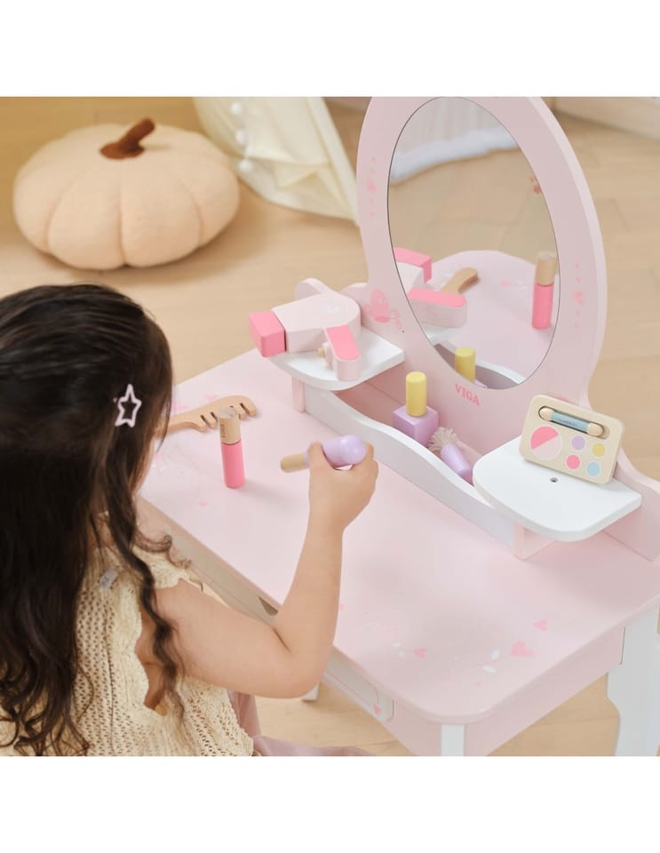 Duża Drewniana toaletka z marki Viga to wyjątkowa drewniana toaletka dla małej księżniczki, która spełni marzenia każdej dziewczynki! Wykonana z najwyższej jakości drewna, w delikatnych odcieniach różu i bieli, ta urocza toaletka zachwyca swoim bajkowym designem. Stylowe, zaokrąglone kształty, subtelne zdobienia i eleganckie nóżki sprawiają, że doskonale komponuje się w pokoju dziecięcym, dodając mu uroku i magii.Toaletka rozwija kreatywność, wyobraźnię i zachęca do odgrywania ról. Jest również doskonałym pomysłem na prezent – solidne wykonanie i estetyczny wygląd sprawią, że będzie służyć przez lata.