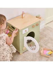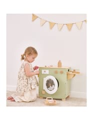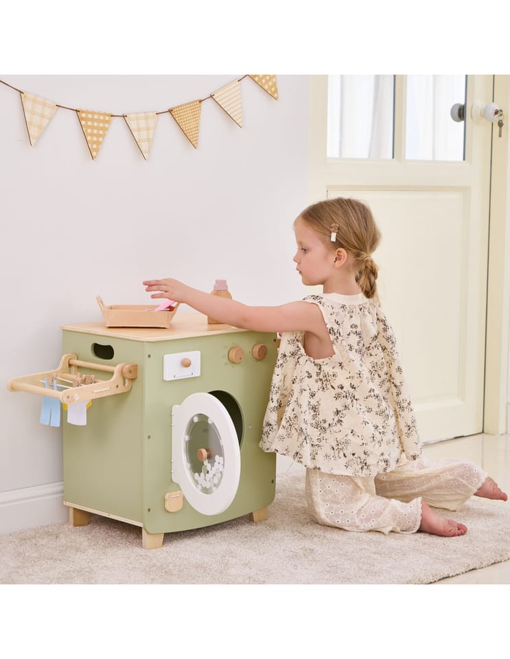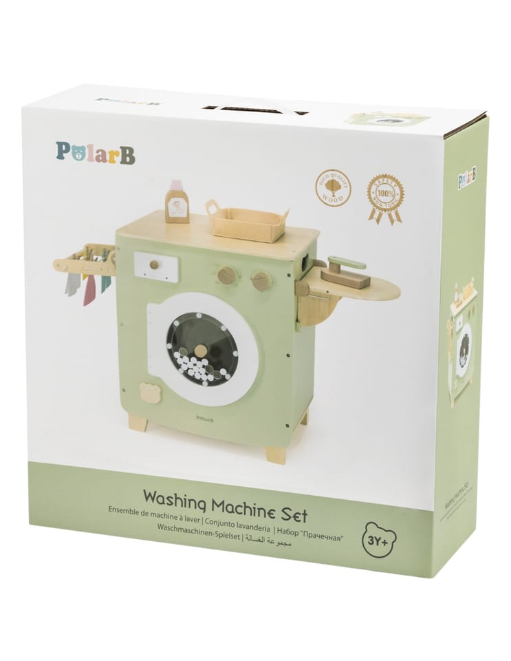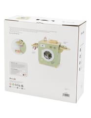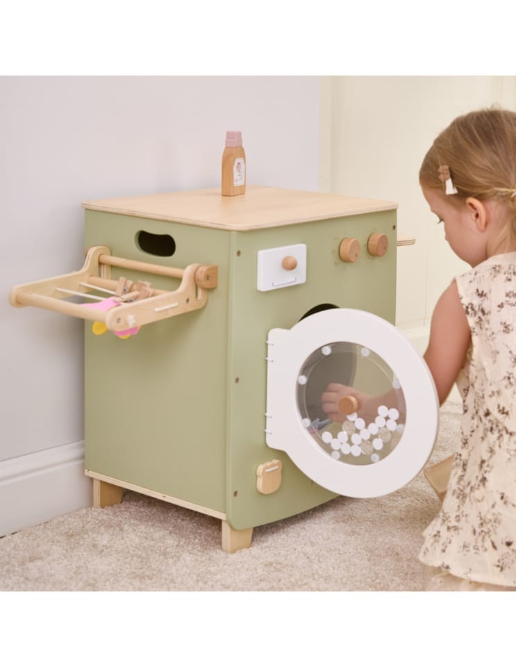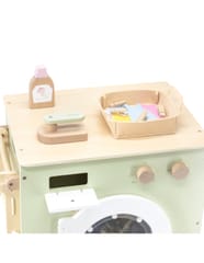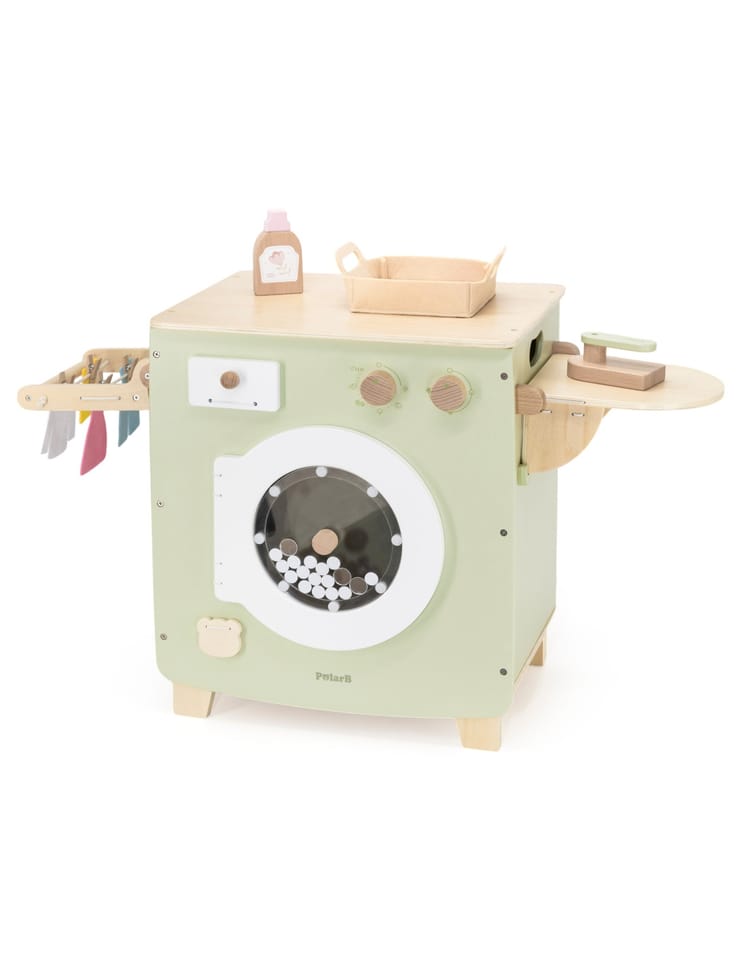 - Dla dzieci od 3 roku życia- Otwierane drzwiczki imitujące prawdziwą pralkę pozwalają na wkładanie i wyjmowanie "prania".- Dwa drewniane pokrętła umożliwiają ustawianie programów, co rozwija zdolności manualne dziecka.- Boczne składane ramiona z mini klamerkami pozwalają na rozwieszenie uroczych kolorowych ubrań z filcu.- Boczna składana mała deska do prasowania- W zestawie znajduje się drewniany płyn do prania, żelazko oraz koszyk na pranie, które urozmaicają zabawę.