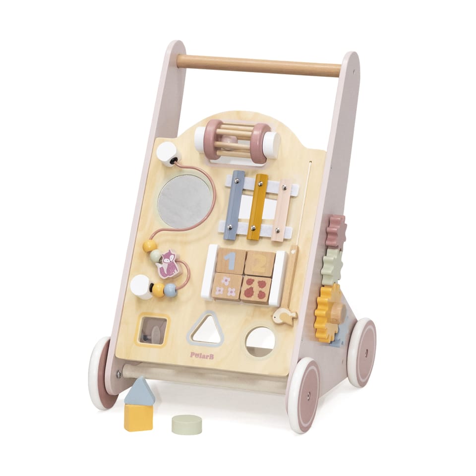 Viga 44259 PolarB Edukacyjny chodzik dla dzieci - pink to wielofunkcyjna zabawka, która wspiera rozwój malucha na różnych poziomach. Oferuje 8 atrakcyjnych aktywności, takich jak gra na cymbałkach, dopasowywanie kształtów, przekręcanie klocków z cyframi oraz bezpieczne lustro, które stymulują zdolności manualne, poznawcze oraz sensoryczne dziecka. Chodzik pomaga także w nauce chodzenia, zapewniając stabilność dzięki solidnym kołom i ergonomicznemu uchwytowi. Dodatkowo posiada płócienną przestrzeń z tyłu, która służy jako miejsce do przechowywania zabawek.Edukacyjny drewniany stylowy i pastelowy chodzik nie tylko rozwija, ale także bawi, zapewniając dziecku bezpieczne pierwsze kroki oraz wszechstronny rozwój. Ten uroczy, drewniany chodzik dla dzieci - pink zapewnia maluchom zabawę dzięki solidnej konstrukcji z drewna.Zalety produktu:Wielość aktywności w jednym produkcie: chodzik oferuje aż 8 różnych aktywności, które wspierają rozwój malucha. Dzieci mogą zajrzeć do lustra, przekręcać klocki z cyframi, grać na cymbałkach, dopasowywać kształty i więcej. To idealna zabawka do wszechstronnego rozwoju dziecka – od nauki cyfr po rozwijanie zdolności manualnych.Wsparcie w nauce chodzenia: dzięki stabilnej konstrukcji i szerokim kołom, chodzik zapewnia bezpieczeństwo i stabilność podczas pierwszych prób chodzenia. Dzieci mogą bezpiecznie stawiać pierwsze kroki, rozwijając przy tym równowagę i koordynację.Estetyka i funkcjonalność: pastelowa kolorystyka oraz starannie zaprojektowane elementy, takie jak grzechotki, klocki, lustro czy zębatki, sprawiają, że chodzik jest nie tylko edukacyjną zabawką, ale też atrakcyjnym elementem pokoju dziecka.funkcja przechowywania: z tyłu znajduje się płócienna przestrzeń na drobne zabawki lub przedmioty, co pozwala na łatwe ich przechowywanie i organizację.Bezpieczeństwo i trwałość: wykonany z wysokiej jakości drewna, malowany bezpiecznymi farbami, chodzik jest wytrzymały i w pełni bezpieczny dla dzieci.Korzyści dla Dziecka:-Rozwój motoryczny: chodzik pomaga dziecku stawiać pierwsze kroki, wspierając rozwój mięśni nóg, równowagi i koordynacji ruchowej.-Zdolności poznawcze: dzięki aktywnościom takim jak gra na cymbałkach, przekręcanie klocków z cyframi i dopasowywanie kształtów, dziecko rozwija swoje zdolności logicznego myślenia, rozpoznawania kolorów i kształtów oraz uczy się podstaw liczenia.-Rozwój sensoryczny: zabawa z lustrem, przesuwanie koralików oraz inne interaktywne elementy stymulują zmysły dotyku, wzroku i słuchu, co wspiera pełniejsze poznawanie otaczającego świata. -Zdolności manualne: przesuwanie elementów, dopasowywanie kształtów i manipulowanie różnymi aktywnościami rozwija precyzję ruchów rąk i palców, co wspiera motorykę małą.-Samodzielność: chodzik motywuje dziecko do samodzielnej eksploracji przestrzeni, co buduje jego pewność siebie i niezależność.-Kreatywność i zabawa: różnorodność aktywności zapewnia godziny kreatywnej zabawy, wspierając rozwój wyobraźni i kreatywności.Jak korzystać z produktu:Nauka chodzenia: Chodzik świetnie sprawdza się jako wsparcie przy nauce chodzenia. dziecko może przytrzymać się uchwytu, popychać chodzik przed sobą, stawiając pierwsze kroki w bezpieczny sposób. Zabawa edukacyjna: dziecko może bawić się na stojąco lub siedząco, wykorzystując różne aktywności na panelu chodzika, takie jak dopasowywanie kształtów, gra na cymbałkach czy obracanie klocków z cyframi, co wspiera jego rozwój sensoryczny i poznawczy.Przechowywanie: Dzięki płóciennej przestrzeni z tyłu chodzika można przechowywać drobne zabawki, co pozwala na lepszą organizację miejsca zabawy.Wybierając 44259 PolarB Edukacyjny chodzik dla dzieci - pink, dajesz swojemu dziecku nie tylko zabawkę, ale również narzędzie do rozwijania kluczowych umiejętności. Ten chodzik to wszechstronne narzędzie, które wspiera zarówno rozwój fizyczny, jak i umysłowy dziecka w jego pierwszych miesiącach życia.Elementy zabawki zostały zapakowane w estetyczny, kolorowe pudełko z uchwytem do przenoszenia, dzięki temu estetycznemu opakowaniu zabawka jest idealna na prezent! Całość wykonana została z drewna bukowego i pomalowana farbami, które zadowolą każdego użytkownika i dadzą mnóstwo radości z zabawy.Naszym priorytetem jest bezpieczeństwo i jakość oferowanych produktów, dlatego dbamy o to aby farby, którymi malujemy nasze zabawki spełniały normy bezpieczeństwa ( EN71 i ASTM). Zabawka przeznaczona dla dzieci powyżej 12 miesięcy życia.Wymiary produktu:Dł.393 mm x wys. 510 mm x szer. 314 mmWymiary opakowania:Dł.360 mm x wys. 85 mm x szer. 500 mmWaga netto: 2,30 kgWaga brutto: 2,60 kg Ilość kartonowa: 4 szt.Opisy