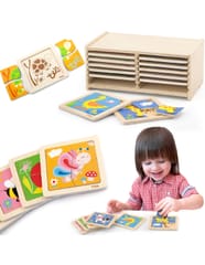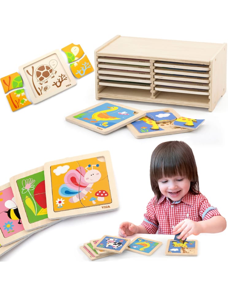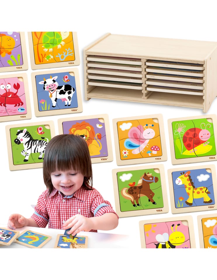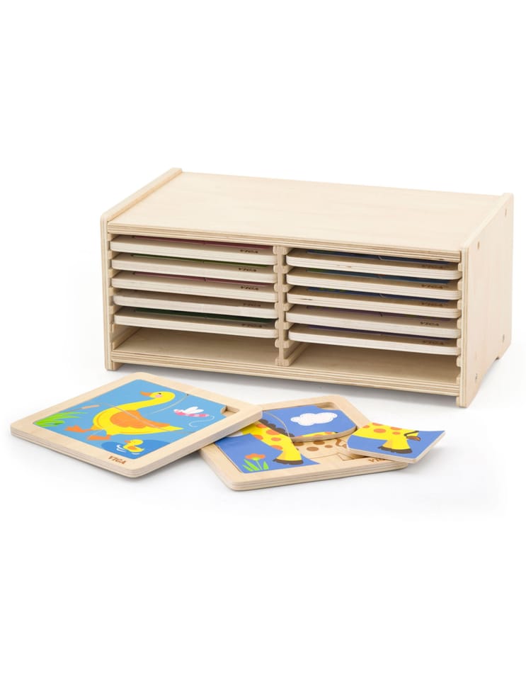 Zestaw drewnianych puzzli w ramkach od renomowanej firmy Viga to doskonała propozycja dla najmłodszych, która w kreatywny sposób wprowadza dzieci w świat nauki i zabawy. Ten rozbudowany zestaw składa się aż z 12 kolorowych plansz, z których każda przedstawia inny, przyjazny motyw – od uroczych zwierzątek po popularne pojazdy. Dzięki drewnianemu stojakowi, utrzymanie porządku w pokoju dziecka staje się niezwykle proste, a wszystkie układanki są zawsze na swoim miejscu. Każda z 12 plansz zawiera 4 dopasowane elementy, co stanowi idealny stopień trudności dla maluchów rozpoczynających swoją przygodę z układaniem. Proste kształty, żywe barwy i estetyczne ilustracje przyciągają uwagę dziecka, zachęcając do wielogodzinnej aktywności.