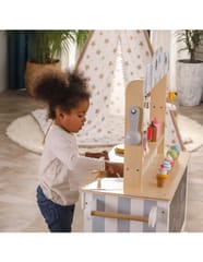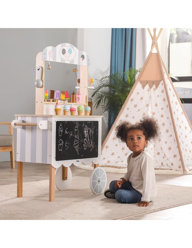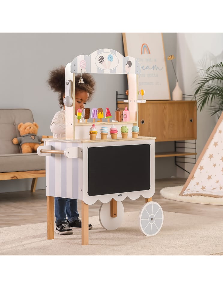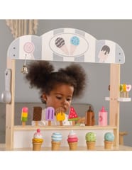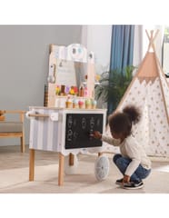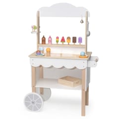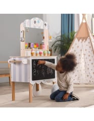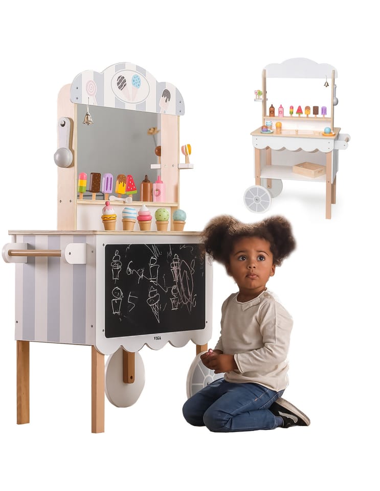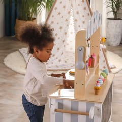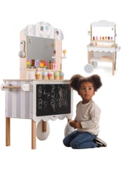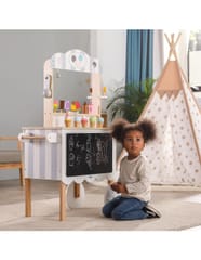 Sklep, Cukiernia, Lodziarnia 3w1 jest doskonałym prezentem dla małych cukierników. Zestaw jest idealny dla dziecka, które chce wcielić się w rolę sprzedawcy czy cukiernika. Dzięki tej zabawce dziecko poczuje się jak profesjonalny sprzedawca słodkości. Zabawka posiada wiele drobniejszych akcesoriów takich jak lizaki, lody, wafelki czy polewy. Dodatkowo sklep posiada tablicę, na której dziecko może malować czy pisać ceny lub dzisiejsze menu. W sklepie znajduje się półeczka, na której można chować różne rzeczy. Całość pomalowana jest nietoksycznymi farbami w łagodnej kolorystyce przyciągającej uwagę dziecka.
