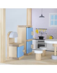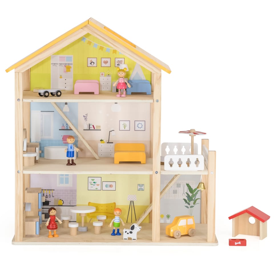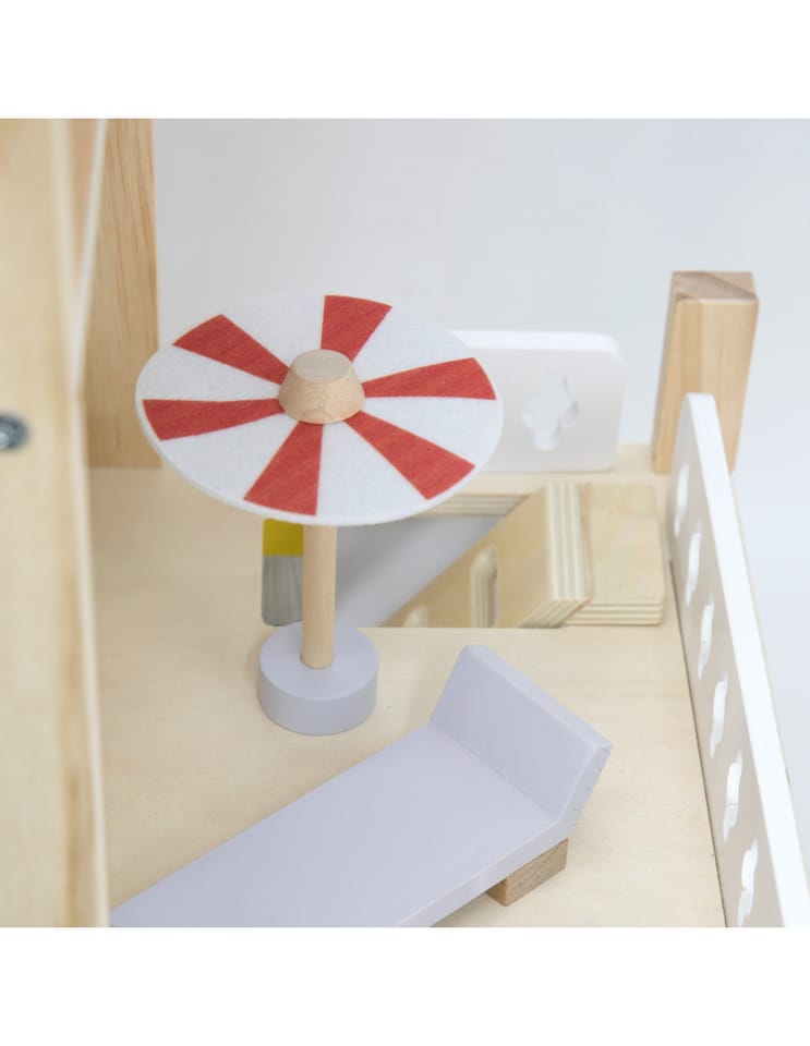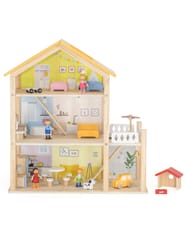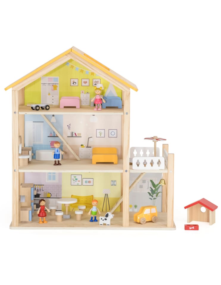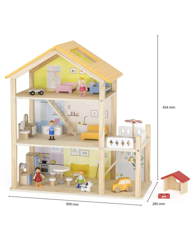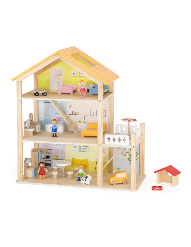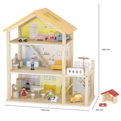 Duży drewniany domek od marki Viga z serii PolarB to zabawka wykonana z naturalnych materiałów wysokiej jakości, która zachwyci twoje dziecko!Domek jest w pełni umeblowany i wyposażony w niezbędne akcesoria. Twoje dziecko znajdzie tu wszystko, czego potrzebuje do stworzenia własnego, bajkowego świata: kuchnię, salon, łazienkę, przytulną sypialnię, pokoik dziecięcy oraz garaż i balkon a nawet domek dla pieska! Każdy pokój został starannie zaprojektowany i wyposażony w mebelki oraz dodatki. Zestaw zachęca do kreatywnej zabawy, rozwija wyobraźnię i umiejętności społeczne.