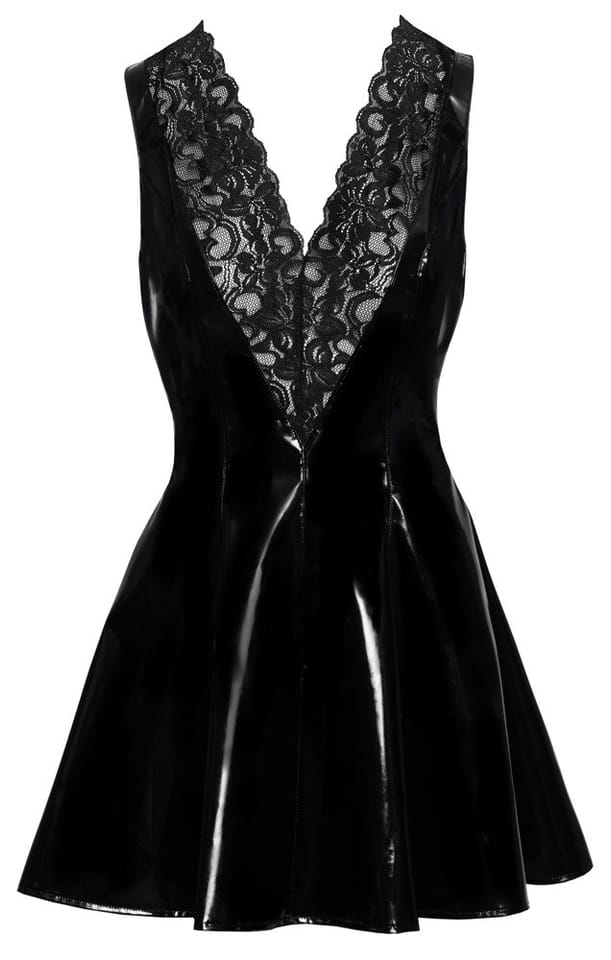 Short, tight-fitting dress made out of vinylWith a flared skirt part V-shaped cleavage area decorated with lace With a zip at the backA seductive gem! The short, sleeveless dress from Black Level is made entirely out of shiny black vinyl. It has a v-shaped lace insert over the low-cut cleavage area. It is tight-fitting and has a flared skirt part. With a zip at the back. 100% polyester, polyurethane coating.