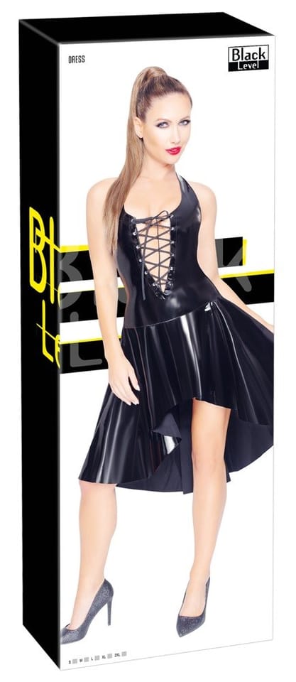Tight-fitting, vinyl dress with a halterneckWith a flared dip hem skirt partVery low-cut V-neck with lacing over the cleavageWith a zip at the backFetish and fashion! The halterneck dress from Black Level is made entirely out of shiny black vinyl. The dress is tight-fitting and is also has sexy lacing over the low-cut V-neck that only just covers the nipples. The flared, swaying, dip hem skirt part is shorter at the front than the back. There is a zip at the back. The halterneck has a press stud fastener. 100% polyester, polyurethane coating.