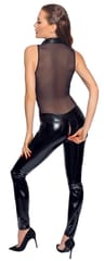 Sleeveless vinyl jumpsuitPowernet back 2-way zip stops at the top of the buttocksTight-fitting designSinfully shiny clubwear!Sleeveless jumpsuit from Black Level made out of shiny black vinyl with a transparent powernet back. In a tight-fitting design with long, narrow legs and a decorative belt at the front with an eye-catching buckle. The practical, erotic 2-way zip starts in the cleavage area, goes over the crotch and stops at the top of the buttocks. It can be opened quickly from both ends.100% polyester, polyurethane coating.