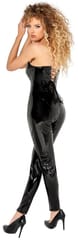 Curvaceous design in a corset style!Figure-hugging strap jumpsuit from Black Level completely in black vinyl with long slim legs. Can also be worn strapless - the adjustable straps are removable. Waisted top designed like a corset; reinforced with variable lacing in the back. The silver-coloured 3-way zip runs from the neckline through the crotch to the lacing above the bottom; it can be opened in different ways. 100% polyester, polyurethane coating.