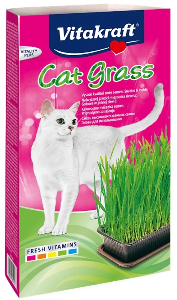 Karma uzupełniająca dla kotów. Wyselekcjonowane, specjalistyczne nasiona traw o wysokiej zdolności kiełkowania i dużej zawartości naturalnych witamin, minerałów oraz chlorofilu. Trawa stymuluje przemianę materii i wywołuje wymioty, co pomaga kotu wydalić nagromadzoną w żołądku sierść.