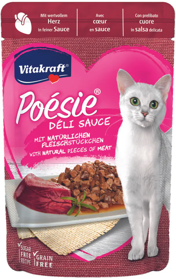 Karma pełnoporcjowa mokra dla kotów w pysznym delikatnym sosie. Z wysokiej jakości naturalnymi kawałkami mięsa lub ryby - widoczna wysoka jakość. Nie zawiera cukru ani zbóż, jak również sztucznych konserwantów, barwników i aromatów. Szeroki wachlarz smaków: 6 wariantów dla dorosłych kotów oraz 2 specjalne w wersji JUNIOR.
