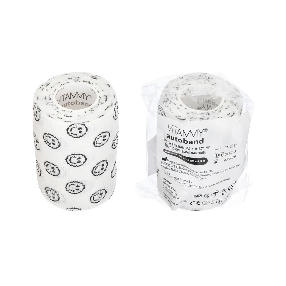 Elastyczny bandaż kohezyjny Vitammy Autoband dostępny w wielu kolorach i rozmiarach. Praktyczny, wygodny bandaż Vitammy Autoband jest uniwersalnym rozwiązaniem do mocowania opatrunków, opatrywania zwichnięć, złamań, jak i zmniejszania zakresu ruchomości stawu po urazie. Bandaż kohezyjny dzięki technologii mikrowłókien łączy się wyłącznie sam ze sobą. Nie zawiera kleju dzięki czemu nie brudzi skóry, nie skleja włosów i nie przykleja się do ubrań jednocześnie zachowując właściwości samoprzylepne. Niezawodny bandaż, który zapewnia pełną swobodę ruchu i skuteczną ochronę. Kohezyjny bandaż elastyczny to podstawowy element wyposażenia każdej apteczki. Elastyczne bandaże kohezyjne Vitammy Autoband dostępne są w rozmiarach o długości 4,5 m i szerokości 2,5 cm, 5 cm, 7,5 cm oraz 10 cm. Doskonałe przyleganie. Stosując Vitammy Autoband nie potrzebujesz dodatkowych plastrów czy zapinek, co pozwala na szybką i łatwą aplikację. Bandaż utrzymuje stałe naprężenie, nie ulegając poluzowaniu, zapewniając pełne poczucie bezpieczeństwa nawet podczas aktywności fizycznej. Stosowany jako opatrunek ochronny, podtrzymujący lub uciskowy. Zapewnia skórze odpowiednią wentylację. Nie powoduje dyskomfortu podczas zdejmowania opatrunku. Nie klei się do ciała i włosów, a po usunięciu nie pozostawia lepkiego osadu. Jest trwały – odporny na wodę i pot. Nie wymaga stosowania zapinek. Niejałowy. Indywidualnie pakowany. Przeznaczony jest do jednorazowego użytku. Vitammy Autoband ma szerokie zastosowanie. Jest doskonałym rozwiązaniem do mocowania okładów i opatrunków. Stabilnie utrzymuje opatrunek na jego miejscu bez ryzyka że będzie się przesuwał. Jest stosowany w celu usztywniania stawów. Ma zastosowanie jako dodatkowe zabezpieczenie pod ochraniacze. Może być stosowany jako bandaż uciskowy i ochronny. Używany przy urazach mięśni, ścięgien i więzadeł. Wykorzystywany ochronnie w gabinetach manicure i kosmetologii. Długi okres przydatności do użycia. Dzięki nowoczesnemu procesowi produkcji i wyselekcjonowanym materiałom Vitammy Autoband zapewnia trwałość i bezpieczeństwo użytkowania a okres przydatności wynosi aż 3 lata.