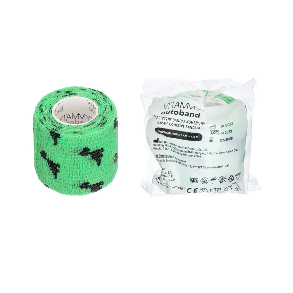 Elastyczny bandaż kohezyjny Vitammy Autoband dostępny w wielu kolorach i rozmiarach. Praktyczny, wygodny bandaż Vitammy Autoband jest uniwersalnym rozwiązaniem do mocowania opatrunków, opatrywania zwichnięć, złamań, jak i zmniejszania zakresu ruchomości stawu po urazie. Bandaż kohezyjny dzięki technologii mikrowłókien łączy się wyłącznie sam ze sobą. Nie zawiera kleju dzięki czemu nie brudzi skóry, nie skleja włosów i nie przykleja się do ubrań jednocześnie zachowując właściwości samoprzylepne. Niezawodny bandaż, który zapewnia pełną swobodę ruchu i skuteczną ochronę. Kohezyjny bandaż elastyczny to podstawowy element wyposażenia każdej apteczki. Elastyczne bandaże kohezyjne Vitammy Autoband dostępne są w rozmiarach o długości 4,5 m i szerokości 2,5 cm, 5 cm, 7,5 cm oraz 10 cm. Doskonałe przyleganie. Stosując Vitammy Autoband nie potrzebujesz dodatkowych plastrów czy zapinek, co pozwala na szybką i łatwą aplikację. Bandaż utrzymuje stałe naprężenie, nie ulegając poluzowaniu, zapewniając pełne poczucie bezpieczeństwa nawet podczas aktywności fizycznej. Stosowany jako opatrunek ochronny, podtrzymujący lub uciskowy. Zapewnia skórze odpowiednią wentylację. Nie powoduje dyskomfortu podczas zdejmowania opatrunku. Nie klei się do ciała i włosów, a po usunięciu nie pozostawia lepkiego osadu. Jest trwały – odporny na wodę i pot. Nie wymaga stosowania zapinek. Niejałowy. Indywidualnie pakowany. Przeznaczony jest do jednorazowego użytku. Vitammy Autoband ma szerokie zastosowanie. Jest doskonałym rozwiązaniem do mocowania okładów i opatrunków. Stabilnie utrzymuje opatrunek na jego miejscu bez ryzyka że będzie się przesuwał. Jest stosowany w celu usztywniania stawów. Ma zastosowanie jako dodatkowe zabezpieczenie pod ochraniacze. Może być stosowany jako bandaż uciskowy i ochronny. Używany przy urazach mięśni, ścięgien i więzadeł. Wykorzystywany ochronnie w gabinetach manicure i kosmetologii. Długi okres przydatności do użycia. Dzięki nowoczesnemu procesowi produkcji i wyselekcjonowanym materiałom Vitammy Autoband zapewnia trwałość i bezpieczeństwo użytkowania a okres przydatności wynosi aż 3 lata.