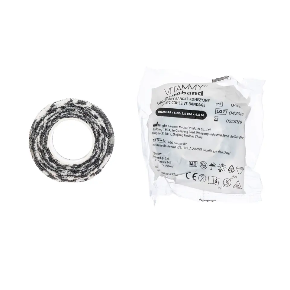 Elastyczny bandaż kohezyjny Vitammy Autoband dostępny w wielu kolorach i rozmiarach. Praktyczny, wygodny bandaż Vitammy Autoband jest uniwersalnym rozwiązaniem do mocowania opatrunków, opatrywania zwichnięć, złamań, jak i zmniejszania zakresu ruchomości stawu po urazie. Bandaż kohezyjny dzięki technologii mikrowłókien łączy się wyłącznie sam ze sobą. Nie zawiera kleju dzięki czemu nie brudzi skóry, nie skleja włosów i nie przykleja się do ubrań jednocześnie zachowując właściwości samoprzylepne. Niezawodny bandaż, który zapewnia pełną swobodę ruchu i skuteczną ochronę. Kohezyjny bandaż elastyczny to podstawowy element wyposażenia każdej apteczki. Elastyczne bandaże kohezyjne Vitammy Autoband dostępne są w rozmiarach o długości 4,5 m i szerokości 2,5 cm, 5 cm, 7,5 cm oraz 10 cm. Doskonałe przyleganie. Stosując Vitammy Autoband nie potrzebujesz dodatkowych plastrów czy zapinek, co pozwala na szybką i łatwą aplikację. Bandaż utrzymuje stałe naprężenie, nie ulegając poluzowaniu, zapewniając pełne poczucie bezpieczeństwa nawet podczas aktywności fizycznej. Stosowany jako opatrunek ochronny, podtrzymujący lub uciskowy. Zapewnia skórze odpowiednią wentylację. Nie powoduje dyskomfortu podczas zdejmowania opatrunku. Nie klei się do ciała i włosów, a po usunięciu nie pozostawia lepkiego osadu. Jest trwały – odporny na wodę i pot. Nie wymaga stosowania zapinek. Niejałowy. Indywidualnie pakowany. Przeznaczony jest do jednorazowego użytku. Vitammy Autoband ma szerokie zastosowanie. Jest doskonałym rozwiązaniem do mocowania okładów i opatrunków. Stabilnie utrzymuje opatrunek na jego miejscu bez ryzyka że będzie się przesuwał. Jest stosowany w celu usztywniania stawów. Ma zastosowanie jako dodatkowe zabezpieczenie pod ochraniacze. Może być stosowany jako bandaż uciskowy i ochronny. Używany przy urazach mięśni, ścięgien i więzadeł. Wykorzystywany ochronnie w gabinetach manicure i kosmetologii. Długi okres przydatności do użycia. Dzięki nowoczesnemu procesowi produkcji i wyselekcjonowanym materiałom Vitammy Autoband zapewnia trwałość i bezpieczeństwo użytkowania a okres przydatności wynosi aż 3 lata.