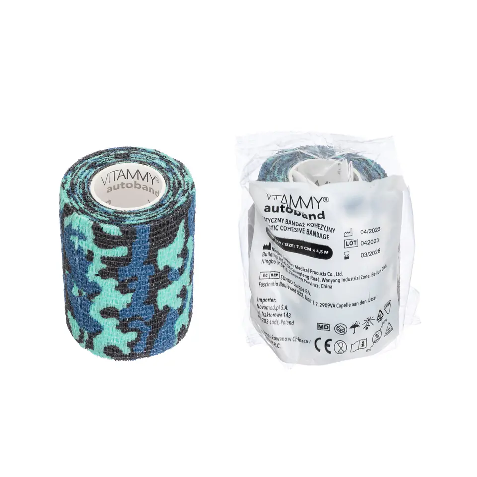 Elastyczny bandaż kohezyjny Vitammy Autoband dostępny w wielu kolorach i rozmiarach. Praktyczny, wygodny bandaż Vitammy Autoband jest uniwersalnym rozwiązaniem do mocowania opatrunków, opatrywania zwichnięć, złamań, jak i zmniejszania zakresu ruchomości stawu po urazie. Bandaż kohezyjny dzięki technologii mikrowłókien łączy się wyłącznie sam ze sobą. Nie zawiera kleju dzięki czemu nie brudzi skóry, nie skleja włosów i nie przykleja się do ubrań jednocześnie zachowując właściwości samoprzylepne. Niezawodny bandaż, który zapewnia pełną swobodę ruchu i skuteczną ochronę. Kohezyjny bandaż elastyczny to podstawowy element wyposażenia każdej apteczki. Elastyczne bandaże kohezyjne Vitammy Autoband dostępne są w rozmiarach o długości 4,5 m i szerokości 2,5 cm, 5 cm, 7,5 cm oraz 10 cm. Doskonałe przyleganie. Stosując Vitammy Autoband nie potrzebujesz dodatkowych plastrów czy zapinek, co pozwala na szybką i łatwą aplikację. Bandaż utrzymuje stałe naprężenie, nie ulegając poluzowaniu, zapewniając pełne poczucie bezpieczeństwa nawet podczas aktywności fizycznej. Stosowany jako opatrunek ochronny, podtrzymujący lub uciskowy. Zapewnia skórze odpowiednią wentylację. Nie powoduje dyskomfortu podczas zdejmowania opatrunku. Nie klei się do ciała i włosów, a po usunięciu nie pozostawia lepkiego osadu. Jest trwały – odporny na wodę i pot. Nie wymaga stosowania zapinek. Niejałowy. Indywidualnie pakowany. Przeznaczony jest do jednorazowego użytku. Vitammy Autoband ma szerokie zastosowanie. Jest doskonałym rozwiązaniem do mocowania okładów i opatrunków. Stabilnie utrzymuje opatrunek na jego miejscu bez ryzyka że będzie się przesuwał. Jest stosowany w celu usztywniania stawów. Ma zastosowanie jako dodatkowe zabezpieczenie pod ochraniacze. Może być stosowany jako bandaż uciskowy i ochronny. Używany przy urazach mięśni, ścięgien i więzadeł. Wykorzystywany ochronnie w gabinetach manicure i kosmetologii. Długi okres przydatności do użycia. Dzięki nowoczesnemu procesowi produkcji i wyselekcjonowanym materiałom Vitammy Autoband zapewnia trwałość i bezpieczeństwo użytkowania a okres przydatności wynosi aż 3 lata.