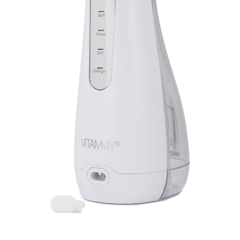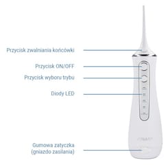 Irygator działa bezprzewodowo nawet przez 60 minut na jednym ładowaniu, zapewniając swobodę codziennej pielęgnacji jamy ustnej i wygodę w podróży. Wbudowana dioda LED informuje o konieczności doładowania, a ładowanie przez uniwersalne złącze USB typu A, pasujące do większości ładowarek, jest szybkie i wygodne. Dodatkowo gumowa zatyczka skutecznie chroni gniazdo przed wilgocią.