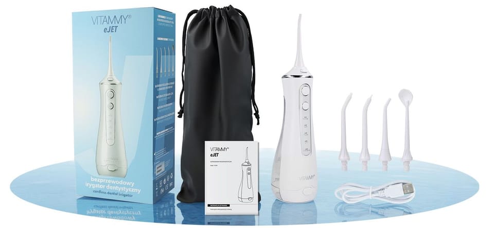 ●Irygator Vitammy eJET ze zbiornikiem na wodę ●5 końcówek ●Kabel USB-C ●Worek podróżny ●Instrukcja obsługi