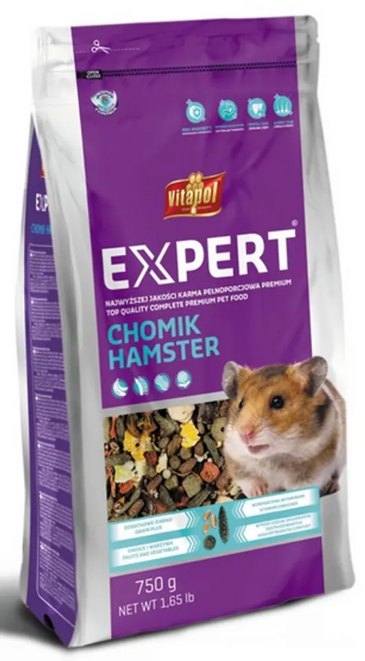 Expert w żywieniu chomików to karma pełnoporcjowa w przewadze skomponowana ze składników poddanych procesowi ekstruzji, przez co wszystkie wartościowe składniki żywieniowe są jeszcze bardziej dostępne i przyswajalne przez organizm. Karma ta uzupełniona jest owocami i warzywami poddanymi naturalnym procesom suszenia dla zapewnienia dostępu do naturalnych witamin oraz poprawy smaku i zwiększenia chęci pobierania pokarmu przez zwierzęta. Ekstrudaty opracowane do wymogów żywieniowych chomików, z odpowiednio dobranym kompleksem witamin i minerałów dla zapewnienia dobrej formy i witalności. Receptura wzbogacona o całe ziarna zbóż i nasion dla zapewnienia odpowiedniego poziomu białka tych wszystkożernych gryzoni. Odpowiednia wielkość i struktura składników zachęca do pobierania pokarmu i wpływa pozytywnie na stan siekaczy. Dodatek ziół wspiera procesy trawienne a wyciąg z juki ogranicza nieprzyjemną woń zwierzęcych odchodów.