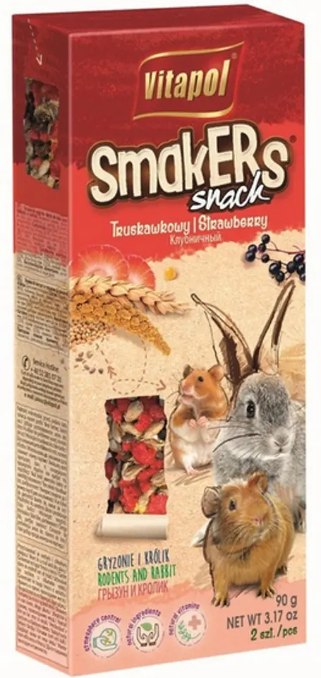 Smakers stanowi urozmaicenie i uzupełnienie diety gryzoni i królików. Podstawowym składnikiem jest owoc truskawki w towarzystwie maliny oraz czarnego bzu. Truskawka zawiera błonnik, witaminy C, B1, B2, B3 i A oraz minerały: wapń, fosfor, magnez, żelazo i mangan. Zawierają łatwo przyswajalne cukry. Ma działanie wzmacniające, ściągające, przeciwbiegunkowe, krwiotwórcze, moczopędne, wzmacniające oraz antynowotworowe. Obecność lnu dobrze wpływa na przewód pokarmowy poprzez regulację trawienia.