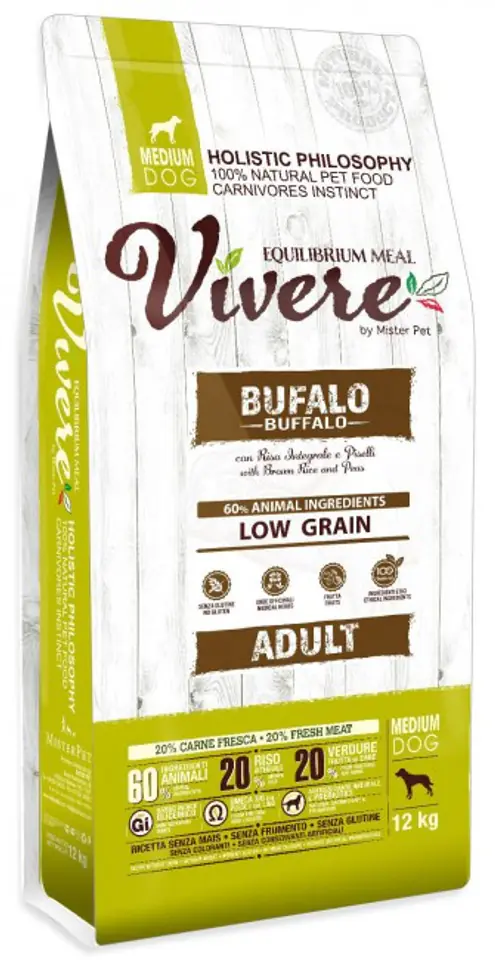 Karma Vivere to pełnoporcjowa, monobiałkowa karma premium dla psów dorosłych średnich ras, opracowana z myślą o naturalnych potrzebach psów jako mięsożerców. Zawiera aż 60% składników pochodzenia zwierzęcego, w tym 20% świeżego mięsa bawolego. Monobiałkowa formuła, oparta wyłącznie na mięsie bawolim, jest idealnym rozwiązaniem dla psów o wrażliwym układzie pokarmowym lub skłonnych do alergii, ponieważ ogranicza ryzyko reakcji alergicznych. Karma jest wyjątkowo smakowita dzięki wysokiej zawartości świeżego mięsa, co sprawia, że każdy posiłek jest prawdziwą ucztą dla Twojego pupila.
