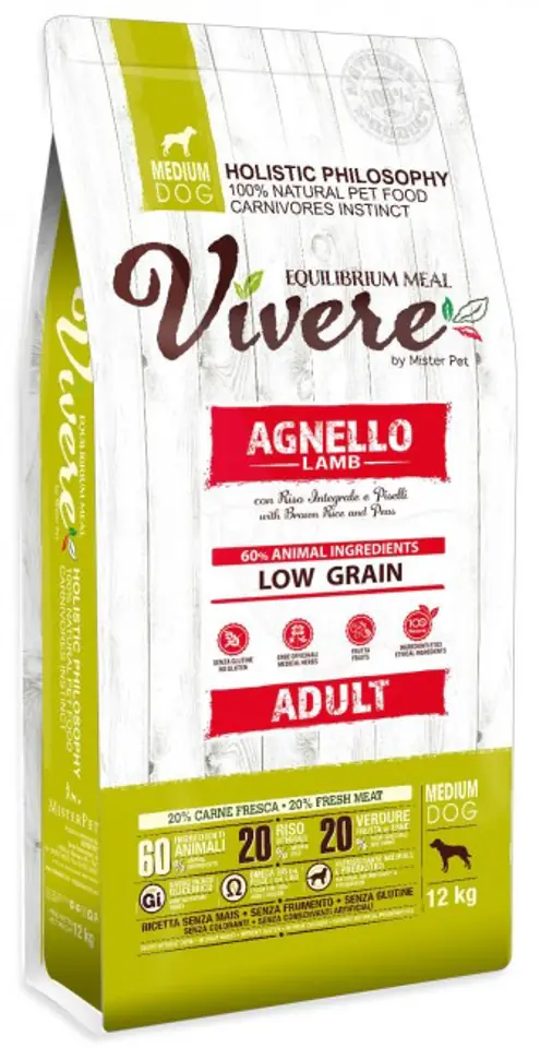 Karma Vivere to pełnoporcjowa, monobiałkowa karma premium dla psów dorosłych średnich ras, opracowana z myślą o naturalnych potrzebach psów jako mięsożerców. Zawiera aż 60% składników pochodzenia zwierzęcego, w tym 20% świeżego mięsa jagnięcego. Monobiałkowa formuła, oparta wyłącznie na mięsie jagnięcym, jest idealnym rozwiązaniem dla psów o wrażliwym układzie pokarmowym lub skłonnych do alergii, ponieważ ogranicza ryzyko reakcji alergicznych. Karma jest wyjątkowo smakowita dzięki wysokiej zawartości świeżego mięsa, co sprawia, że każdy posiłek jest prawdziwą ucztą dla Twojego pupila. Wybierz Vivere – zdrowie Twojego pupila w każdym kęsie!