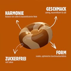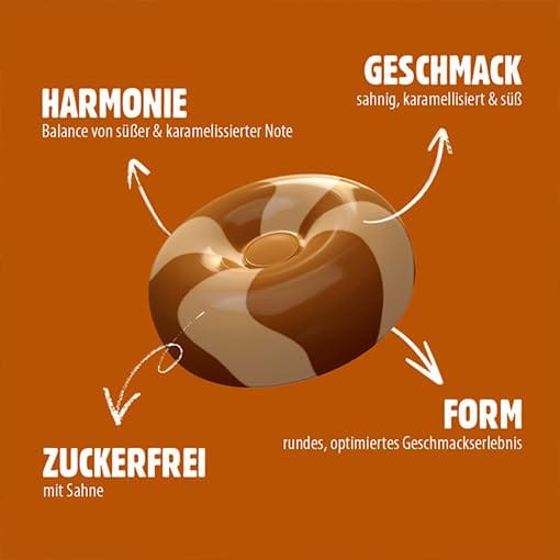 Składniki: Substancje słodzące: izomalt, syrop maltitolowy; TŁUSZCZ BUTICZNY (7,8%), ŚMIETANA (6,5%), sól, aromaty, karmelowy syrop cukrowy, emulgator: lecytyny (SOJA); Substancja słodząca: Acesulfam K
