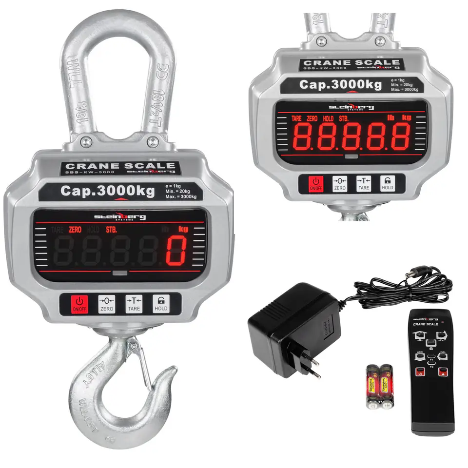 Nazwa producenta: SBS-KW-3000Profesjonalna, elektroniczna waga hakowa służąca do ważenia dużych i ciężkich przedmiotów podwieszonych na haku.Karabińczyk i obrotowy hak wykonane są z galwanizowanej stali, wytrzymała obudowa aluminiowa odlewana ciśnieniowo. Duży czytelny wyświetlacz zapewnia komfortową obsługę z dużej odległości.Wygodna i łatwa w użyciu posiada wiele przydatnych funkcji oraz pilota zdalnego sterowania. Wbudowany akumulator jest ładowany przez dołączany zasilacz i zapewnia wielogodzinną pracę .Waga przeznaczona jest do przemysłu, magazynów, centrów logistycznych, skupów złomu i innych miejscach gdzie wymaga się bezpiecznej wagi do dużych obciążeń.Jest to również waga suwnicowa, która zabezpieczy suwnicę przed przeciążeniem wydając donośny sygnał dźwiękowy.Waga GOTOWA DO PRACY. W dostawie otrzymają Państwo wszystkie niezbędne podzespoły oraz baterie.Parametry techniczne:
