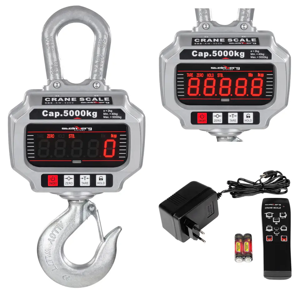 Nazwa producenta: Steinberg Systems SBS-KW-5000 Profesjonalna, elektroniczna waga hakowa służąca do ważenia dużych i ciężkich przedmiotów podwieszonych na haku. Karabińczyk i obrotowy hak wykonane są z galwanizowanej stali, wytrzymała obudowa aluminiowa odlewana ciśnieniowo. Duży czytelny wyświetlacz zapewnia komfortową obsługę z dużej odległości. Wygodna i łatwa w użyciu posiada wiele przydatnych funkcji oraz pilota zdalnego sterowania. Wbudowany akumulator jest ładowany przez dołączany zasilacz i zapewnia wielogodzinną pracę . Waga przeznaczona jest do przemysłu, magazynów, centrów logistycznych, skupów złomu i innych miejscach gdzie wymaga się bezpiecznej wagi do dużych obciążeń. Jest to również waga suwnicowa, która zabezpieczy suwnicę przed przeciążeniem wydając donośny sygnał dźwiękowy. Waga GOTOWA DO PRACY. W dostawie otrzymają Państwo wszystkie niezbędne podzespoły oraz baterie.Parametry techniczne: