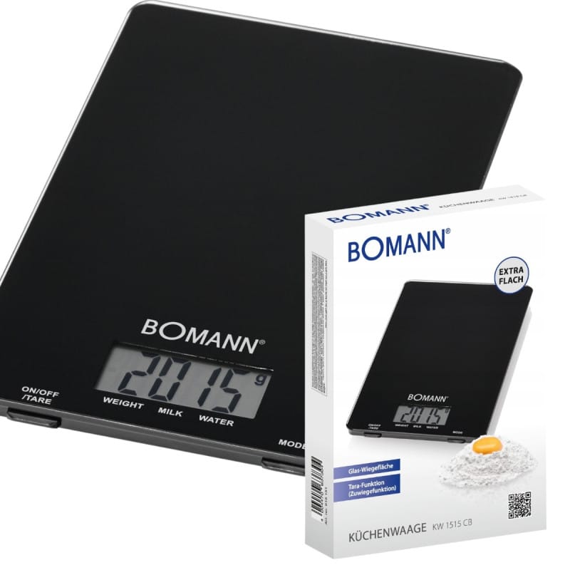 WAGA KUCHENNA ELEKTRONICZNA PRECYZYJNA 1G/5000G Z WYŚWIETLACZEM CZARNA NAJWYŻSZEJ JAKOŚCIWAGA KUCHENNARENOMOWANEJ FIRMY BOMANNMODEL : KW 1515 CBKOLOR CZARNYKażdemu zdarzyło się już kiedyś zepsuć nawet najłatwiejsze ciasto w świecie, biorąc produkty "na oko" i ...Teraz jest to już całkowicie niemożliwe z tą ultra cienką wagą kuchenną.Jej niezwykle dokładne pomiary do 1 grama nie dopuszczą do braku precyzji i do błędów w odmierzaniu składników.Elegancka waga kuchenna, ze szklaną powierzchnią będzie się dobrze prezentować stojąc na blacie, by zawsze być pod ręką.Odmierza co do 1 grama produkty do 5 kg maksymalnie.Możesz dopasować miarę wagi oraz objętości - ponieważ także mierzy objętość mleka i wody, aby ułatwić zadania w kuchni.Funkcja tary i wygodny wyświetlacz LCD sprawiają, że korzystanie z niej jest szybkie i przyjemne.Waga kuchenna - praktyczne urządzenie, które warto zawsze mieć pod ręką - teraz może być także piękne i eleganckie. Pasujące do nowoczesnych wnętrz. Szklana powierzchnia nasycona kolorem, świetnie się prezentuje uzupełniając pomieszczenie dobrym designem. Wagę skontrolujesz patrząc na wygodny wyświetlacz LCD.Funkcja tary daje możliwość odliczania naczynia w którym umieszczone są produkty spożywcze, tak aby precyzyjnie odmierzyć produkty znajdujące się w środku. Do wyboru masz mierzenie wagi - w gramach lub lb-oz (ang. miara) oraz objętości cieczy z rozróżnieniem na wodę i mleko w mililitrach i fl-oz (ang. miara)Dlaczego warto wybrać wagę Bomann Precyzyjny pomiarNowoczesny wyglądFunkcja oszczędzania energiiPrzejrzysty podświetlany wyświetlaczFunkcja tarowaniaAntypoślizgowe stopkiNowoczesny designFront urządzenia wykonano ze stali nierdzewnej pokrytej srebrnym kolorem, taki zabieg sprawia że waga będzie stanowić również idealną dekorację w każdej kuchni. Ponadto nadzwyczaj płaska obudowa nie zajmuje dużo miejsca i ułatwia jej przechowywanie.Duży i czytelny wyświetlaczWaga wyposażona została w wyświetlacz, na którym bez problemu odczytamy uzyskaną wagę. Dodatkowo ekran jest podświetlany na niebiesko, co jeszcze bardziej ułatwia pracę z urządzeniem.Najważniejsze cechy szklanej wagi kuchennej Bomann WK 1515 CB:¦ Wyjątkowo płaska, cyfrowa waga kuchenna¦ Powierzchnia wagowa wykonana z wysokiej jakości szkła¦ Czytelny wyświetlacz LCD¦ Zakres pomiarowy do 5 kg (co 1 g)¦ Regulowane jednostki miary: g, lb-oz (waga) oraz ml, fl-oz (objętość wody i mleka)¦ Automatyczne wyłączanie wydłuża żywotność baterii¦ Włącznik / wyłącznik¦ Funkcja tary (funkcja ważenia addytywnego)¦ Stabilna podstawa dzięki gumowanym nóżkom¦ Wskaźnik niskiego poziomu baterii¦ Zasilanie bateryjne: 1x CR 2032 (w zestawie)(Bateria: 1x litowa, 2,80 g)