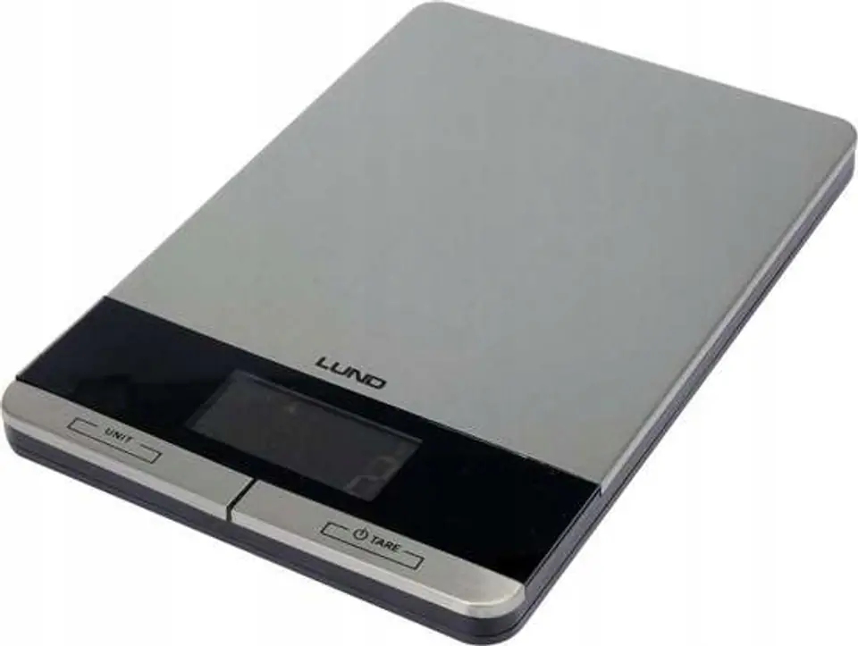 Waga kuchenna LUND z płytą wykonaną ze stali nierdzewnej. Wyposażona w czytelny wyświetlacz LCD pokazujący 4 jednostki wagi do wyboru oraz wskaźniki przeciążenia i niskiego poziomu baterii. Maksymalne obciążenie wynosi aż 5kg.