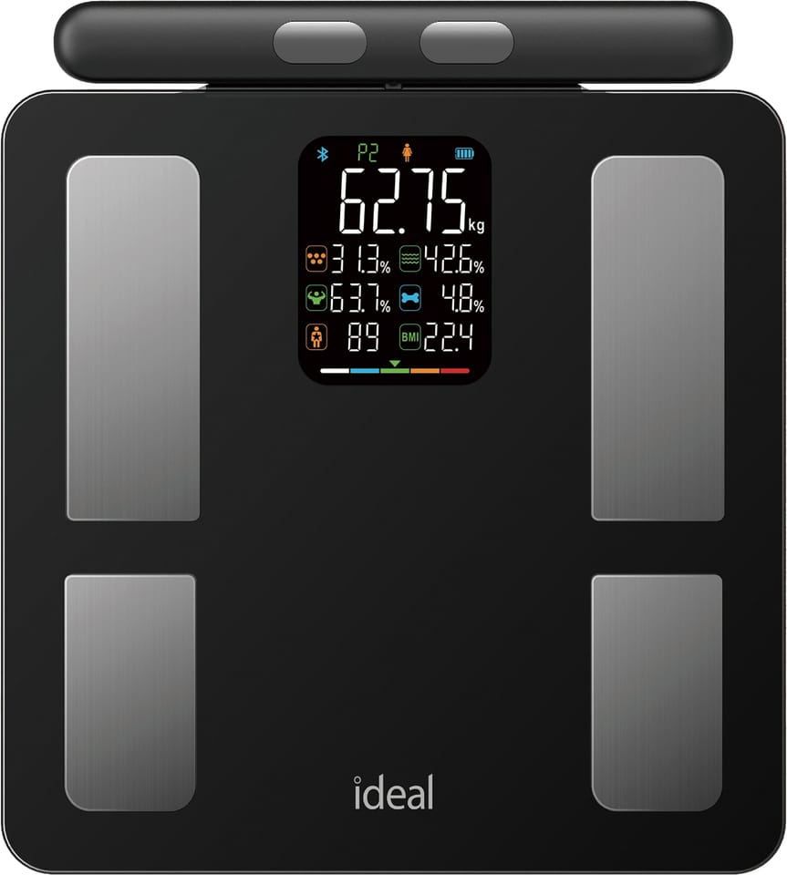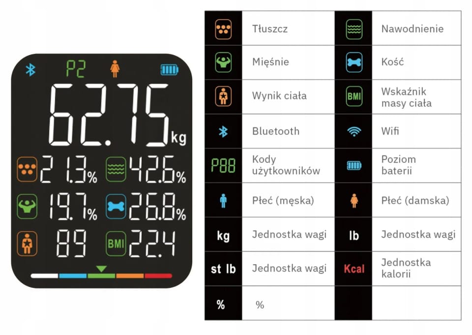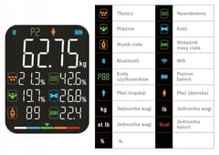 - Wyświetlacz: Kolorowy LCD, wyświetlanie 8 pomiarów na ekranie wagi, Dostęp do wszystkich 15 danych z poziomu aplikacji