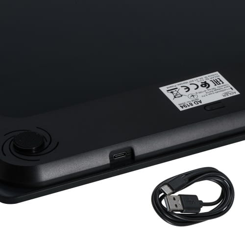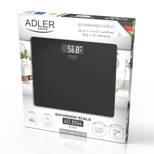 WAGA ŁAZIENKOWA – USBUrządzenie akumulatorowe do wielokrotnego ładowania przewodem USB typu CUdźwig: 180kg /396lb/28.3stDokładność: 100gJednostki miary: kg, lb, stTyp wyświetlacza: LCDRozmiar wyświetlacza: 75x31mmAutomatyczne wyłączanieWskaźnik niskiego poziomu baterii Wskaźnik przeciążenia wagiPlatforma ze szkła hartowanego o grubości 6 mmRozmiar urządzenia: 300x265x22mmWyposażona w 4 wysokiej jakości czujniki tensometrycznePrzewód USB-C w zestawieZasilanie: 5V/1.0AAkumulator: litowo-jonowy 3,7 V 250 mAh