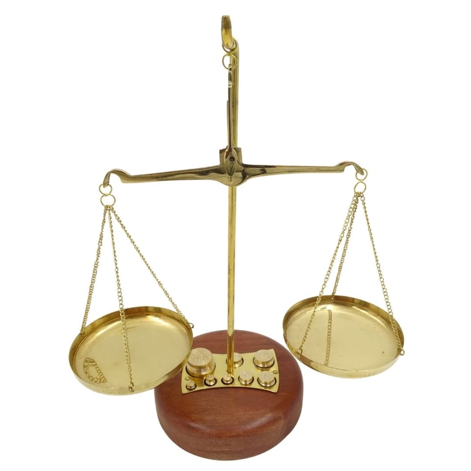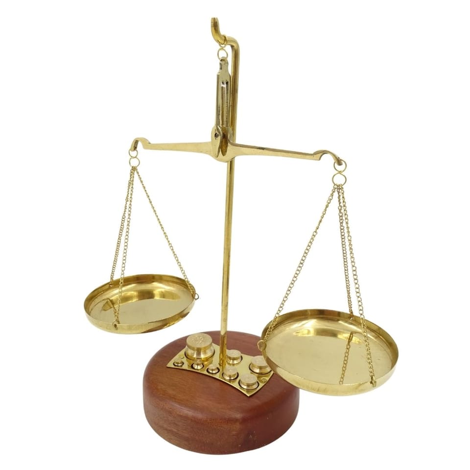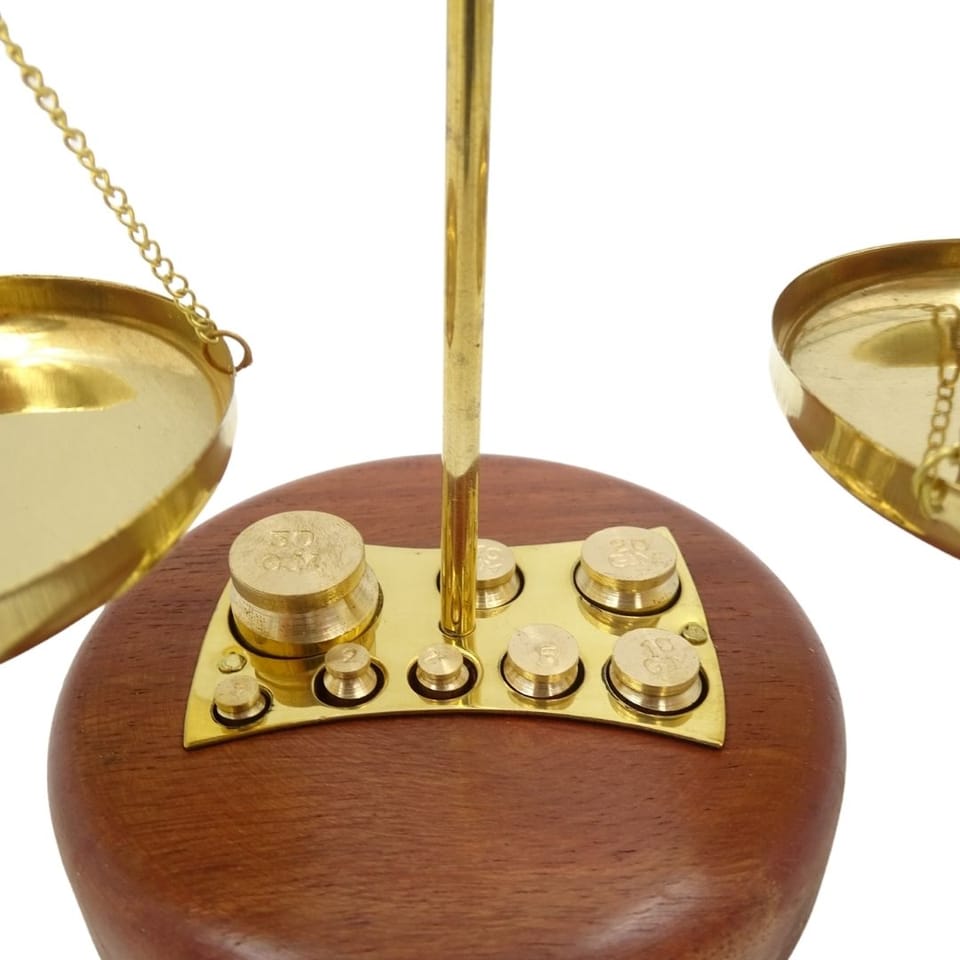 Waga Szalkowa Ozdobna - WSB8 Waga Szalkowa Ozdobna sprawdzi się jako urokliwy dodatek do pomieszczeń w stylu vintage. Będzie pasować do apteki lub stylowego, kameralnego sklepiku. Będzie miłym upominkiem dla farmaceutki oraz symbolicznym prezentem dla prawniczki. Waga jest jednym z atrybutów Temidy – greckiej bogini prawa i praworządności. Symbolizuje sprawiedliwość, rozwagę oraz równowagę. Waga wykonana z mosiądzu z drewnianą podstawą. W skład zestawu wchodzi również 8 odważników. Waga spodoba się dzieciom, które będą mogły jej używać podczas zabawy w sklep. Specyfikacja wagi szalkowej: ·Materiał wykonania: mosiądz ·Postawa: drewniana W zestawie 8 odważników: ·1 g ·2 g x 2 ·5 g ·10 g x 2 ·20 g ·50 g Waga Szalkowa Ozdobna sprawdzi się jako: ·Dekoracja apteki ·Ozdoba gabinetu prawniczki ·Dekoracja do kuchni rustykalnej ·Prezent dla farmaceutki ·Upominek dla prawniczki ·Prezent dla sędziny ·Zabawka dla dzieci do zabawy w sklep Waga nie posiada certyfikatów zezwalających na profesjonalne użycie. Jest to przedmiot dekoracyjny.