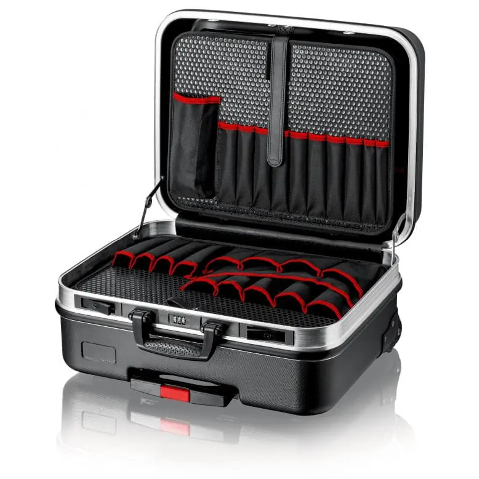 Dno walizki o wysokości 50 mm, które można mocować za pomocą przycisku, możliwość dalszego podziału za pomocą przekładek, panel pokrywy z 12 dużymi kieszeniami na narzędzia i jedną płaską komorą