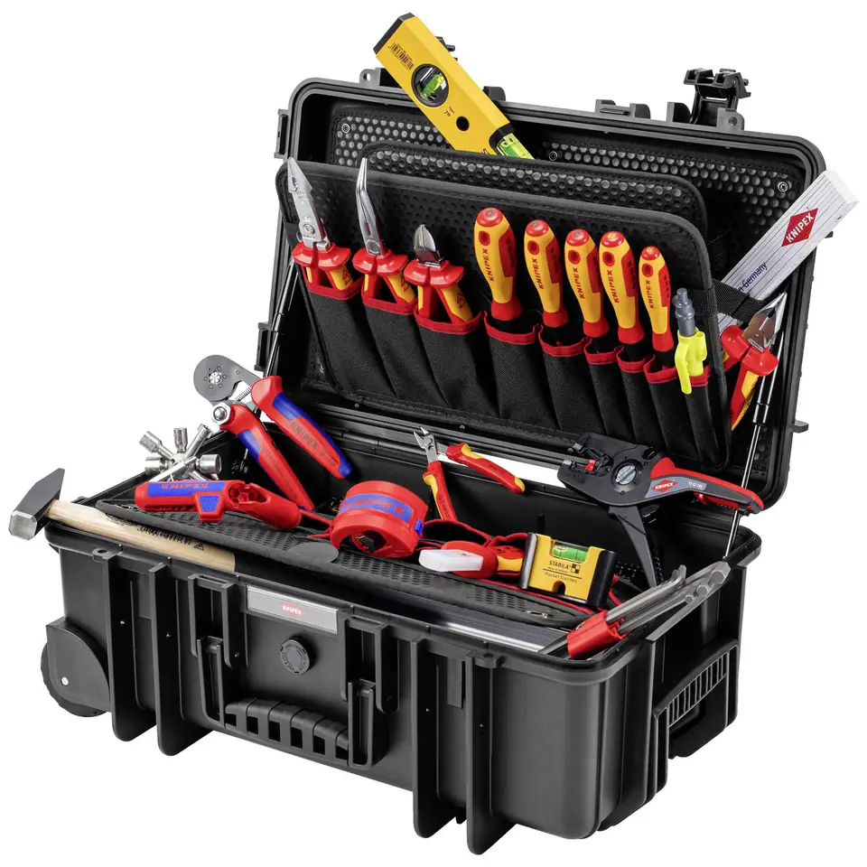 Wyposażona w 16 narzędzi KNIPEX, łącznie 22 markowych narzędzi, częściowo przetestowane przez VDE zgodnie z normą DIN EN 60900