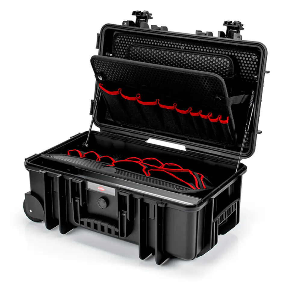 - Walizka z odpornego na uderzenia polipropylenu przystosowana do przewozu samolotem Pyło- i wodoszczelna Zawór automatycznego wyrównania ciśnienia Stabilna temperaturowo w zakresie od - 30°C do + 80°C Uchwyt do zamykania na kłódkę Komora na dokumenty; tablice narzędziowe z odpornego na zabrudzenia tworzywa sztucznego o podwójnych ściankach, kieszonki narzędziowe i uchwyty pętelkowe Zamykany pojemnik dolny z systemem przegródek aluminiowych do indywidualej aranżacji przestrzeni pojemnika Ergonomiczna rękojeść dwukomponentowa Z 19 kieszeniami na narzędzia i 61 uchwytami pętelkowymi