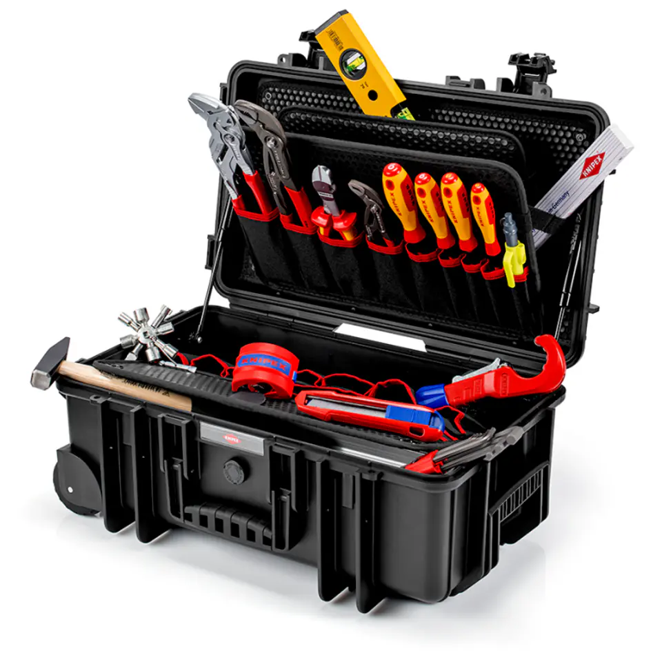 - Walizka z odpornego na uderzenia polipropylenu przystosowana do przewozu samolotem Pyło- i wodoszczelna Zawór automatycznego wyrównania ciśnienia Stabilna temperaturowo w zakresie od - 30°C do + 80°C Uchwyt do zamykania na kłódkę Komora na dokumenty; tablice narzędziowe z odpornego na zabrudzenia tworzywa sztucznego o podwójnych ściankach, kieszonki narzędziowe i uchwyty pętelkowe Zamykany pojemnik dolny z systemem przegródek aluminiowych do indywidualej aranżacji przestrzeni pojemnika Ergonomiczna rękojeść dwukomponentowa Z 19 kieszeniami na narzędzia i 61 uchwytami pętelkowymi Wyposażona w 12 narzędzi KNIPEX, łącznie 17 markowych narzędzi, częściowo przetestowane przez VDE zgodnie z normą DIN EN 60900 Maksymalna ładowność: 25 kg Pojemność: 26,4 litry