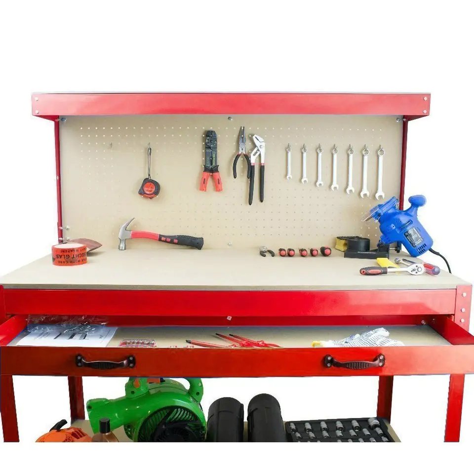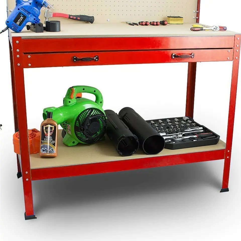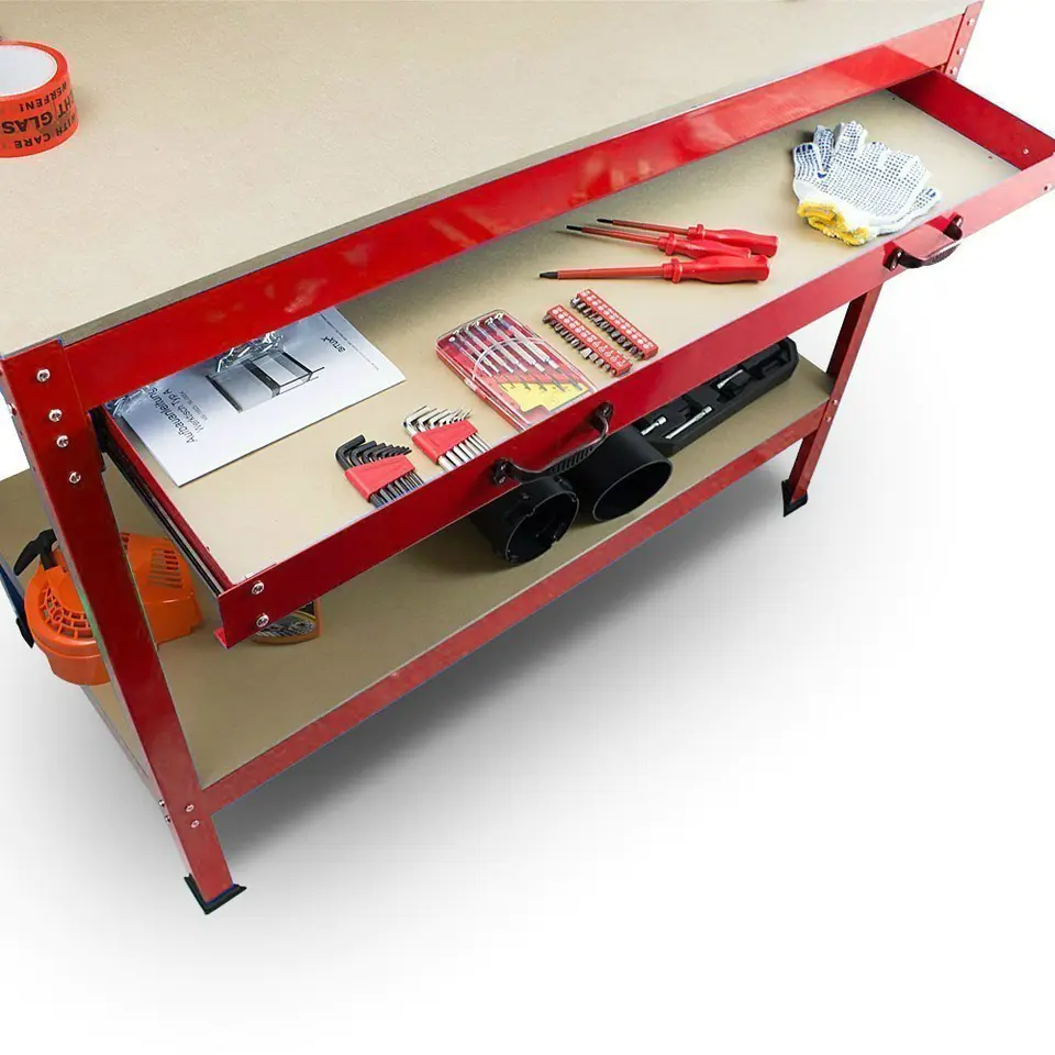 Nasz stół znajdzie praktyczne zastosowanie w każdym warsztacie, garażu czy pomieszczeniu gospodarczym. Duża szuflada na przechowywanie narzędzi, uchwyty na których można powiesić klucze i półka na dowolne akcesoria.W twoim garażu nareszcie zapanuje porządek. Stół został wykonany z wysokiej jakości materiałów dzięki czemu jest stabilny i wytrzyma obciążenie do 100kg. Teraz majsterkowanie będzie prawdziwą przyjemnością.