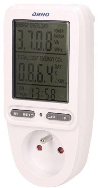 Watomierz umożliwia nam sprawdzenie zużycia prądu elektrycznego i obliczenie kosztów zużytej energii podłączonego urządzenia. Duży wyświetlacz LCD pokazuje dodatkowo: napięcie sieci, prąd w obwodzie, częstotliwość prądu, współczynnik mocy POWER FACTOR, moc podłączonego obciążenia, całkowite zużycie energii kWh, koszt zużytej energii, programowalną cenę 1kWh, łączny czas pomiaru zużycia energii od 0 sek. do 9999 dni, uśrednioną wagę emisji CO2 przy wytworzeniu energii pobranej. Pomiar napięcia: 150V~ 276V~.