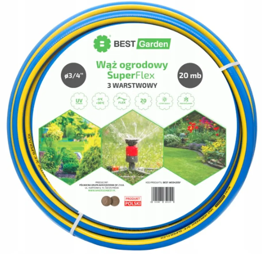 Wąż ogrodowy 3-warstwowy BEST Garden SUPER FLEX wzmocniony oplotem krzyżowym, charakteryzujący się wysoką elastycznością. Warstwa wewnętrzna zapobiega porastaniu glonów, a warstwa zewnętrzna odporna jest na promienie UV. Wąż wielosezonowy. Wyprodukowany w Polsce. Parametry techniczne: średnica: 3/4" ciśnienie maksymalne: 20bar długość rolki: 20m Właściwości użytkowe: wąż 3-warstwowy wzmocnienie węża w oplocie krzyżowym oplot krzyżowy z przędzy poliestrowej wysokiej jakości wewnętrzna warstwa zapobiegająca porastaniu glonów wysoka elastyczność wąż wielosezonowy - efektywna praca w niskich i wysokich temperaturach zakres temperatur: od -5 do +30 stopni C odporny na promieniowanie UV przyjazny dla środowiska - nie zawiera w swoim składzie kadmu (Cd), ołowiu (Pb), baru (Ba) Strona producenta: narzedziabest.pl Producent: Północna Grupa Narzędziowa Sp. z o.o. Adres korespondencyjny: ul. Hurtowa 6, 14-100 Ostróda Adres e-mail: pgn@pgn.com.pl