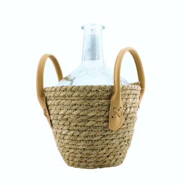 Wazon szklany w koszu z trawy morskiej Boho 18x18x27 cm Wazon to nieodzowny element wyposażenia, każdego domu. Nasza ozdoba oryginalny design zawdzięcza plecionemu koszykowi z trawy morskiej, w którym się znajduje. Wyglądem przypomina butlę na wino. Idealnie pasuje do pomieszczeń urządzonych w stylu boho, skandynawskim czy eko. Specyfikacja: materiał: szkło, trawa morska, wymiary: 18 x 18 x 27 cm,