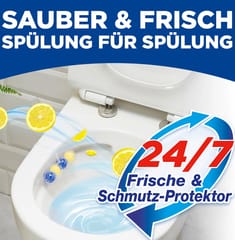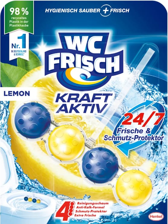 WC-Frisch Blau Kraft-Aktiv Lemon to skuteczny blok do toalety zapewniający dokładne oczyszczenie, ochronę przed kamieniem i długotrwałą świeżość. Dzięki czteroczęściowej formule aktywnej, blok tworzy piankę oczyszczającą, zwalcza brud, chroni przed osadem wapiennym i uwalnia przyjemny zapach cytryny przy każdym spłukaniu.