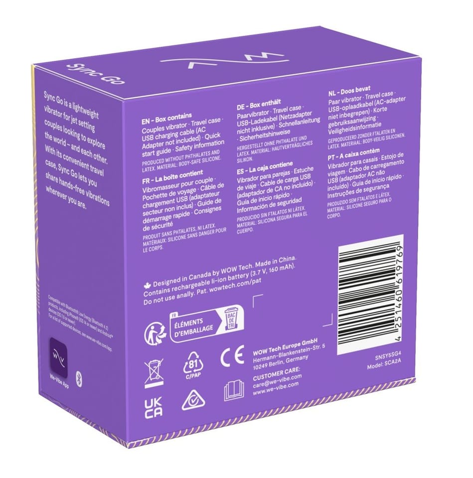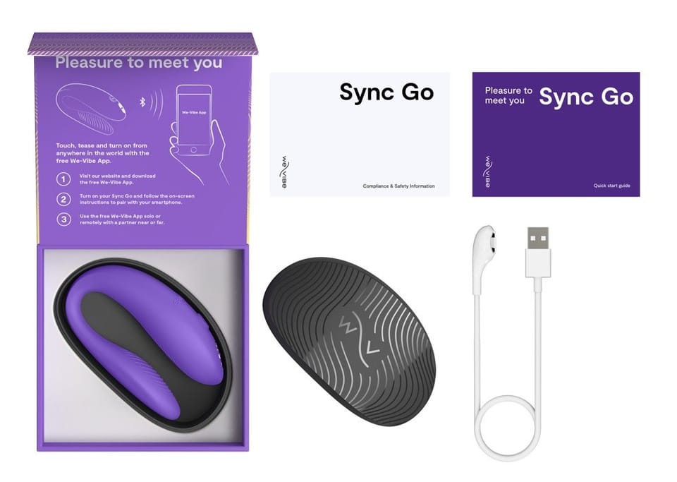 Model Sync Go Purple jest wyposażony w system zdalnego sterowania poprzez aplikację We-Vibe (dostępną na iOS i Android), ktora pozwala na wybor spośrod 10 programow wibracji oraz personalizację własnych ustawień. Aplikacja umożliwia także synchronizację wibracji z muzyką, a także korzystanie z funkcji zdalnej łączności – doskonałe rozwiązanie dla par na odległość. Intuicyjne sterowanie przez smartfon pozwala na pełną swobodę użytkowania i dopasowanie trybow do indywidualnych preferencji.