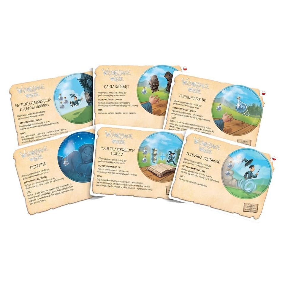 Uwaga, uczniowie szkoły magii! Otrzymaliśmy informację o odnalezieniu kolejnych sześciu zaklęć, które mogą pomóc Wam w egzaminie końcowym! Podkradajcie innym kolby albo wypędzajcie ich czarodziejów z zamku kruków, zamieniajcie karty, przemieszczajcie czarodziejów oraz wieże i rozwińcie podwójną prędkość, a na koniec sprawdźcie, jakie korzyści może Wam przynieść stara dobra drzemka!