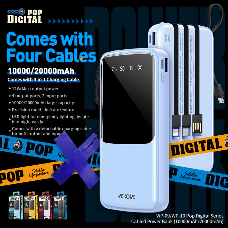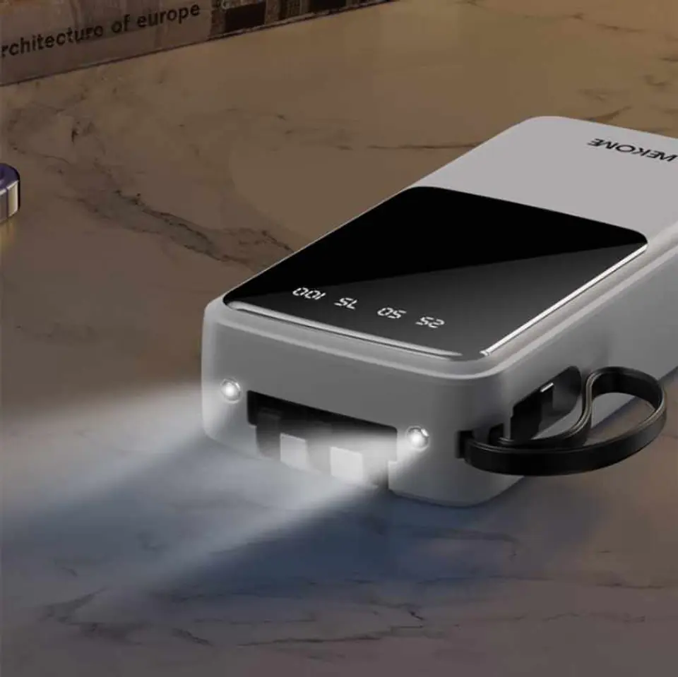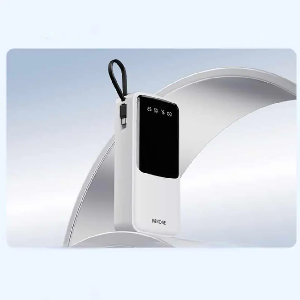 Power bank WEKOME WP-10 Pop Digital Series to niezwykle stylowa i wytrzymała konstrukcja, która pozwala na wygodne i bezpieczne użytkowanie w każdych warunkach.Możesz podłączyć do niego kilka urządzeń jednocześnie i nie martwić się o ich bezpieczeństwo, zaawansowany system ochrony skutecznie zapobiega ich uszkodzeniu. Wbudowany wyświetlacz LED ułatwia korzystanie z produktu, a dzięki kompaktowym rozmiarom i niewielkiej wadze można go zabrać niemal wszędzie.Cechy produktu:· Materiał: ABS+PC· Typ akumulatora: Litowo-polimerowy· Pojemność baterii: 20000 mAh· Pojemność znamionowa: 10800 mAh· Żywotność baterii: 300 cykli· Napięcie wejściowe: USB-C: 5V-2A· Napięcie wejściowe: Kabel USB-A: 5V-2A· Napięcie wyjściowe: Kabel Lightning: 5V-2A· Napięcie wyjściowe: Kabel USB-C: 5V-2A· Napięcie wyjściowe: Kabel Micro USB: 5V-2A· Napięcie wyjściowe: USB-A: 5V-2A· Moc: 12W Max· Cyfrowy wyświetlacz LED· Latarka· Wymiary produktu: 70x32x148 mm· Waga: 419g