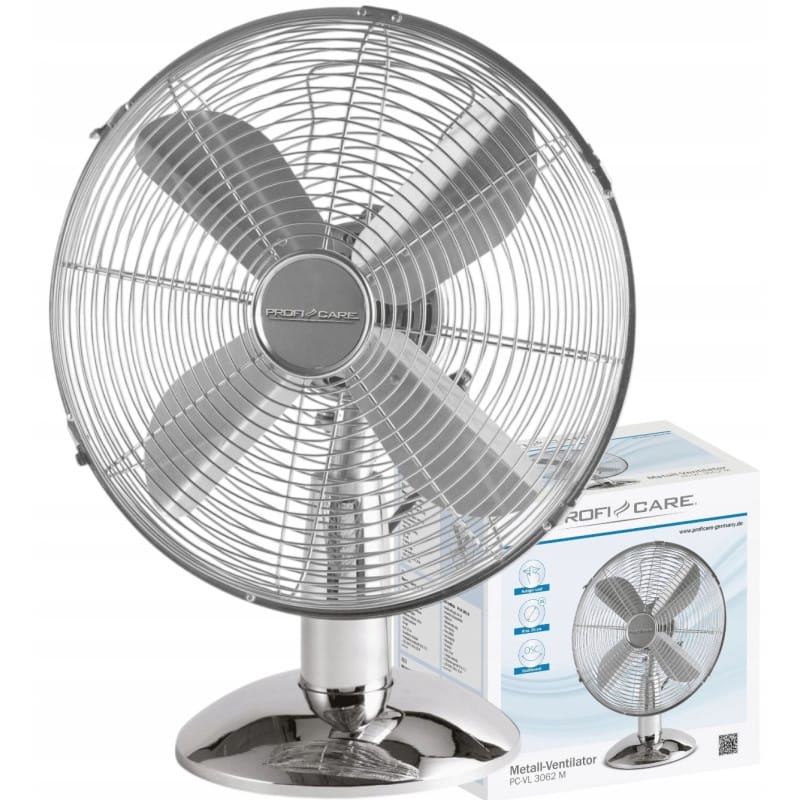NAJWYŻSZEJ JAKOŚCIWENTYLATOR BIURKOWYRENOMOWANEJ FIRMY PROFICAREMODEL: PC-VL 3062 MProfiCare PC-VL 3062 M to wysokiej jakości wentylator biurkowy o średnicy 25 cm - to odpowiednia wielkość, aby szybko ochłodzić gorące powietrze w pomieszczeniu. Dzięki długim, metalowym skrzydłom osiąga prawie 40% lepsze wyniki w cyrkulacji powietrza w porównaniu do innych wentylatorów. Solidna, metalowa budowa to gwarancja trwałości urządzenia a kratka osłaniająca wirnik zwiększa bezpieczeństwo jego użytkowania. Możesz go włączyć bez obawy, nawet gdy w domu jest małe dziecko.Dlaczego warto kupić wentylator ProfiCare PC-VLWydajny25 cm wirnik zapewnia sprawne schładzanie pomieszczeniaWielofunkcyjnyUrządzenie posiada 3 stopnie ustawienia mocy oraz kąt nachyleniaSolidnyMetalowa budowa to gwarancja trwałości urządzenia. Metalowa kratka zwiększa bezpieczeństwo jego użytkowania.Idealny na prezentUrządzenie posiada eleganckie opakowanie, dzięki czemu idealnie sprawdzi się, jako prezent!Trzy stopnie mocy oraz regulowany kąt nachylenia pozwalają na łatwe dostosowanie pracy urządzenia do Twoich potrzeb. Chromowana obudowa w stylu retro pasuje do pomieszczeń urządzonych w każdym stylu.Wentylator posiada funkcję oscylacji, dzięki której może obracać się chłodząc większą powierzchnię.Najważniejsze cechy wentylatora stojącego ProfiCare PC-VL 3062 M:Moc 30 WFunkcja pracy oscylacyjnej z możliwością zatrzymania (kąt 70 stopni)Regulacja kąta nachylenia nawiewuMetalowa kratka ochronnaMetalowa podstawaMetalowa obudowa silnika3 prędkości obrotowe4 stopniowy przełącznik obrotów (0-1-2-3)Średnica O ok. 25 cmOznaczenia CE - spełnia wszystkie restrykcyjne normy UEZasilanie: 220-240 V~, 50 Hz, 30 WWymiary wentylatora:Wymiary (ok. szer. x wys. x gł.) i wagaUrządzenie: 290 x 400 x 240 mm; 3.4 kgOpakowanie: 310 x 310 x 210 mm; 3.9 kg Produkt został odznaczony certyfikatem FOCUS - TEST DEUTSCHLANDS BESTE Certyfikat TEST DEUTSCHLANDS BESTE został przyznany na podstawie badań przeprowadzonych przez „Germanys best household electronics”. W ramach testu porównane zostały produkty z ponad 20 000 marek z 274 segmentów rynkowych. Celem wyróżnienia „Focus” jest wskazywanie produktów cieszących się największym uznaniem konsumentów. Certyfikat przyznany jest na podstawie badań niemieckiego rynku i potwierdza wysoką jakość produktów a także świadczy o dużym zaufaniu konsumentów i renomie marki.