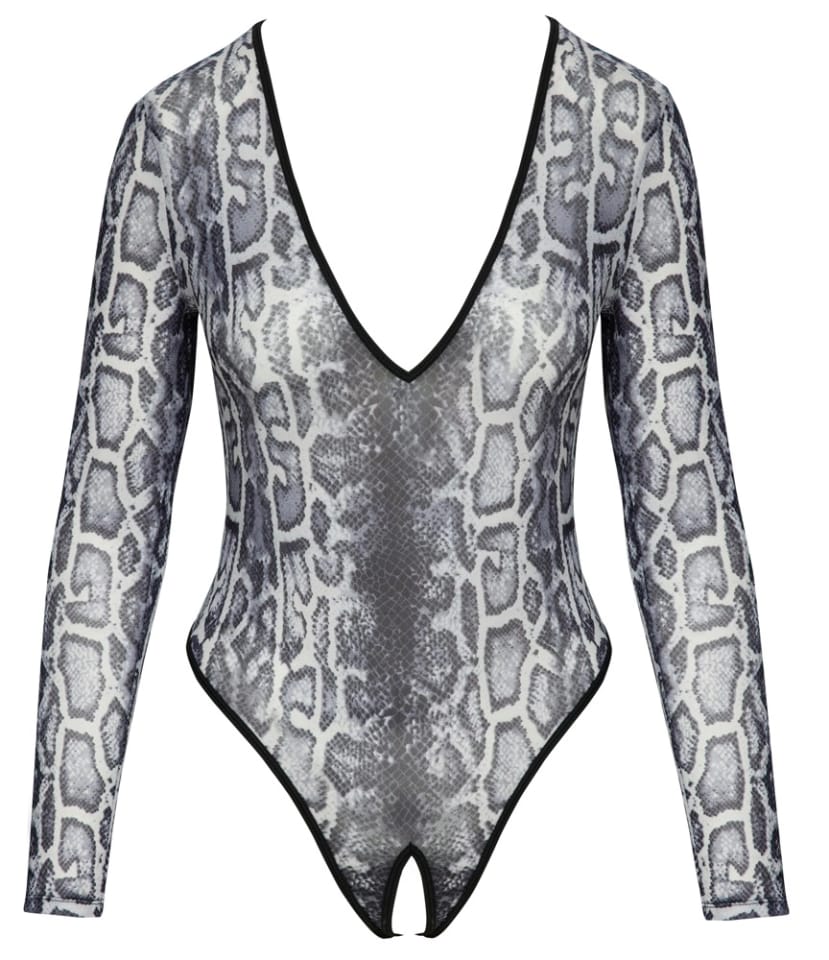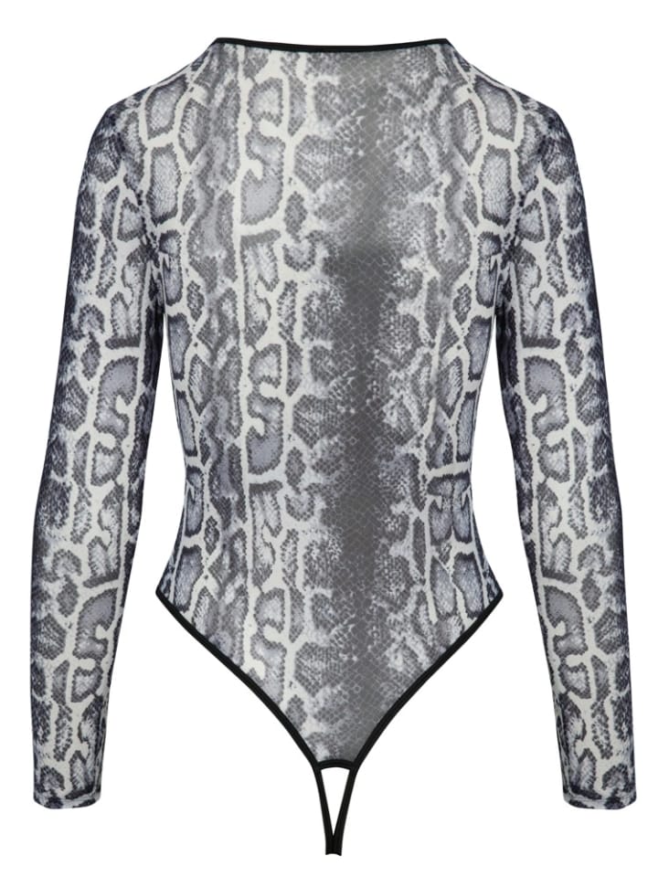 Wężowa skóra w ekscytującej przezroczystości!Bardzo niskie body bez krocza z długim rękawem marki Cottelli LINGERIE o wyglądzie skóry węża. Wykonane w całości z delikatnego, przezroczystego powernetu z misternym nadrukiem. Elastyczne i miękkie na całej powierzchni dla wysokiego poziomu komfortu. Sznurkowy fason rio z bardzo wysokimi wycięciami na nogawkach doskonale eksponuje pośladki i nogi. Uwodzicielsko otwarte w kroku.